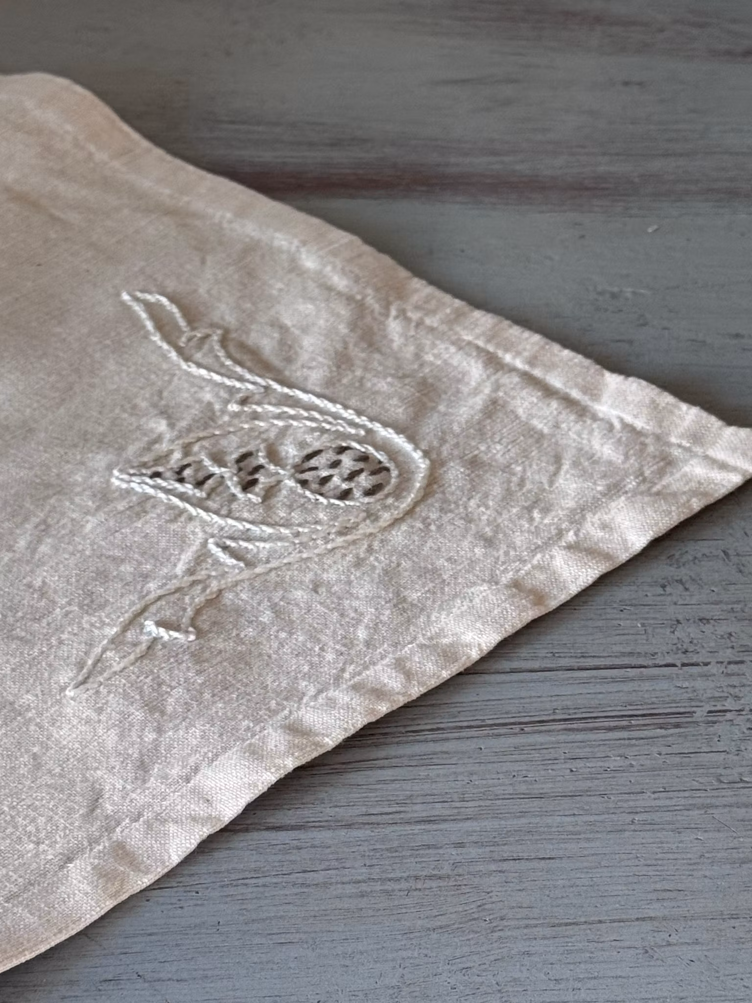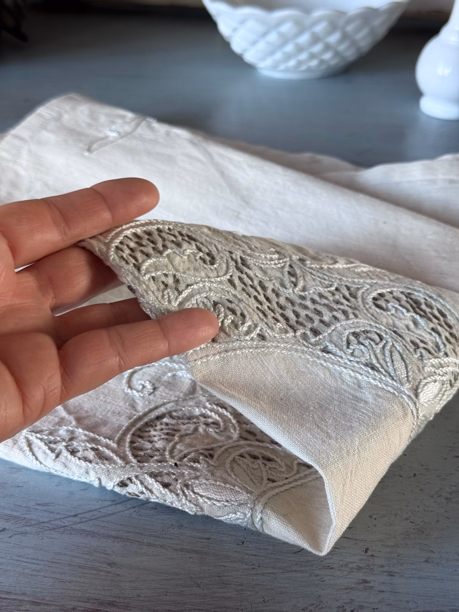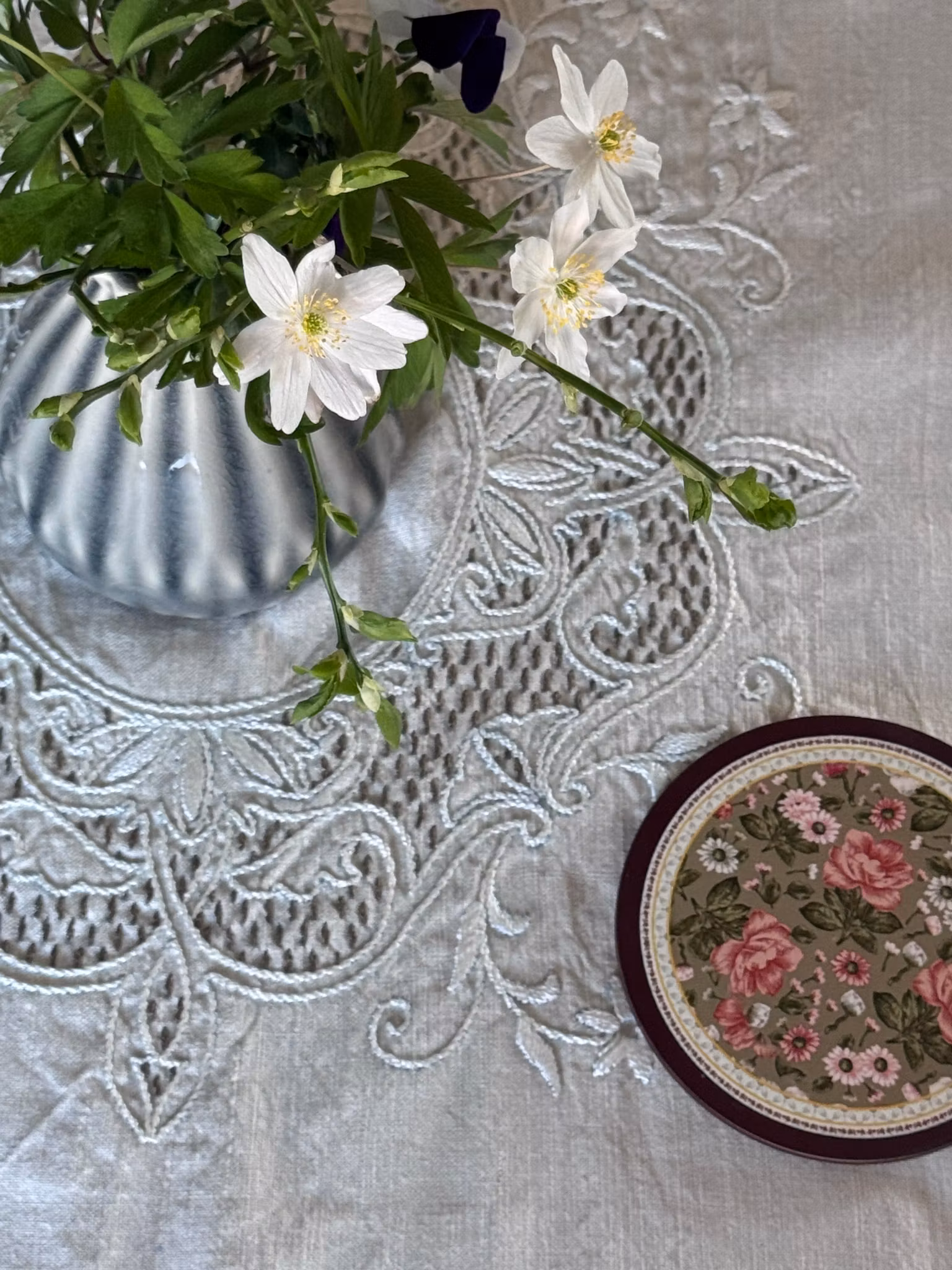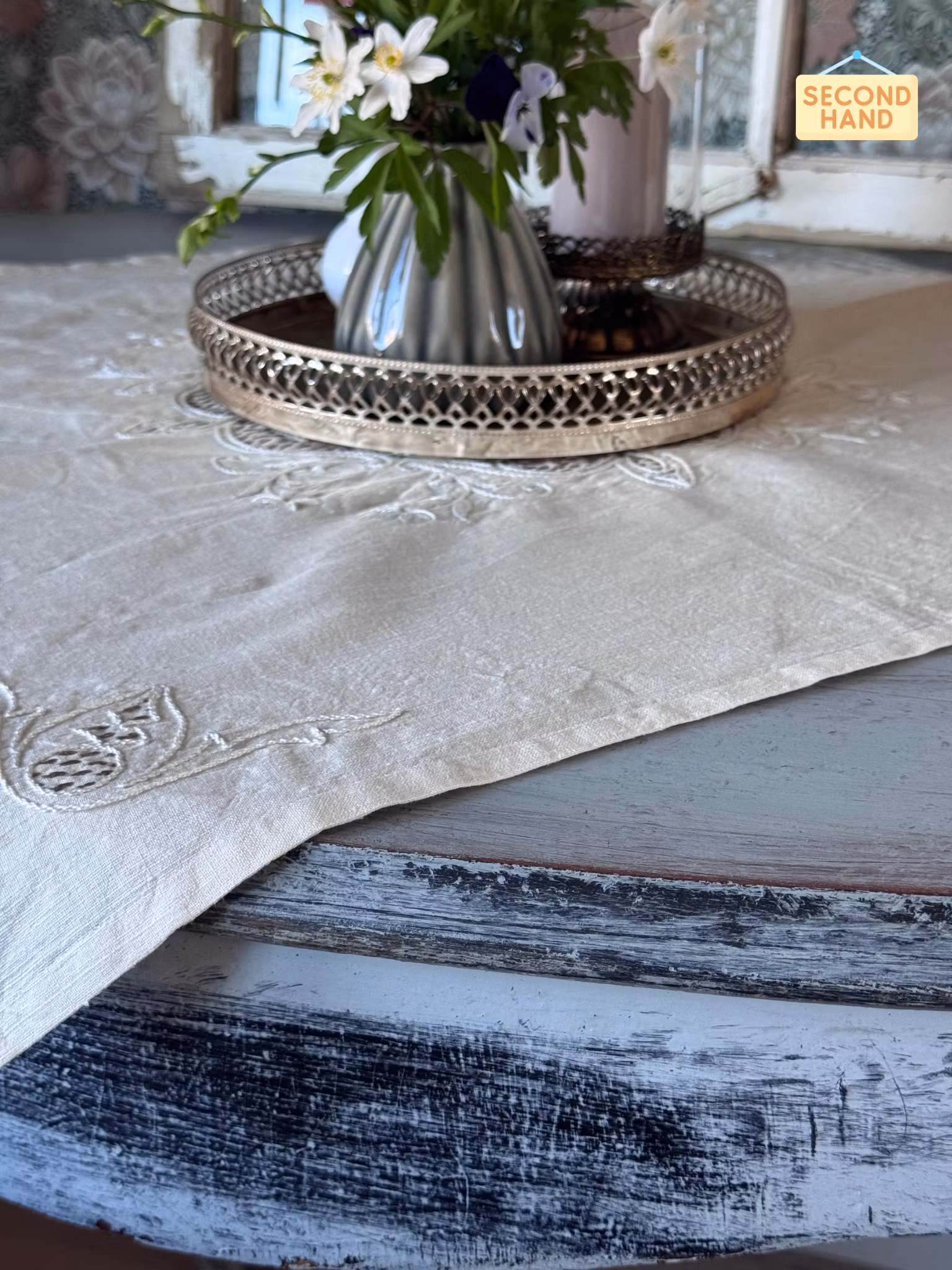 En vacker duk (Second hand) i linne-aktigt material och brodyr som gör att de ser ut som spets. Perfekt storlek till ett mindre bord.