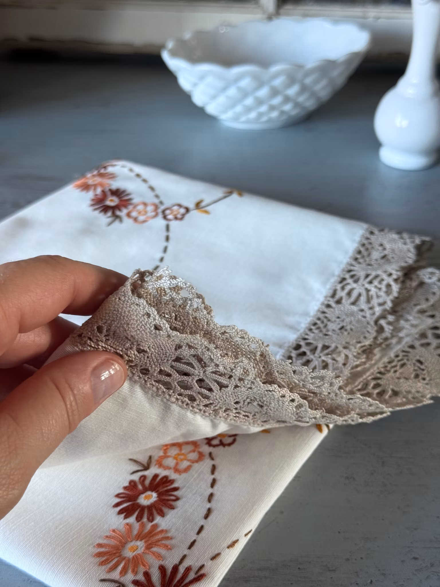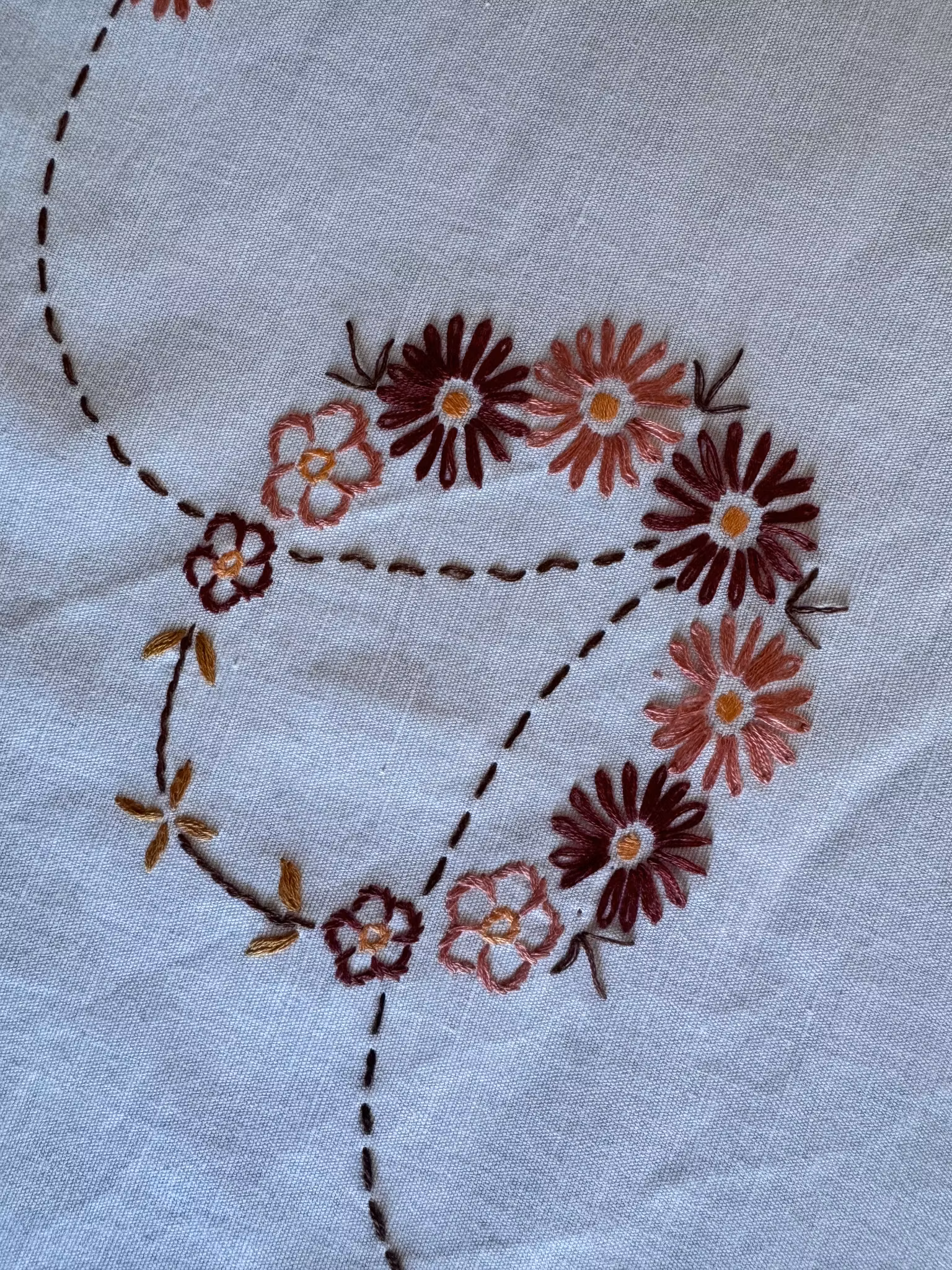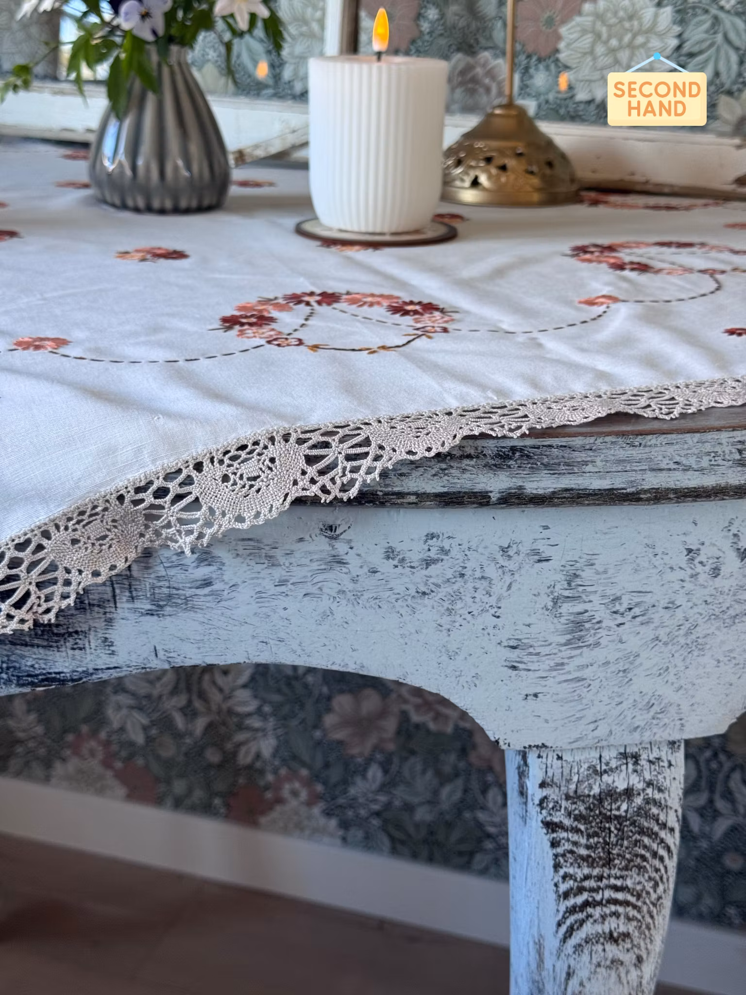 Lantlig duk med vacker brodyr (Second hand). Perfekt storlek för ett mindre rektangulärt, ovalt eller runt bord.