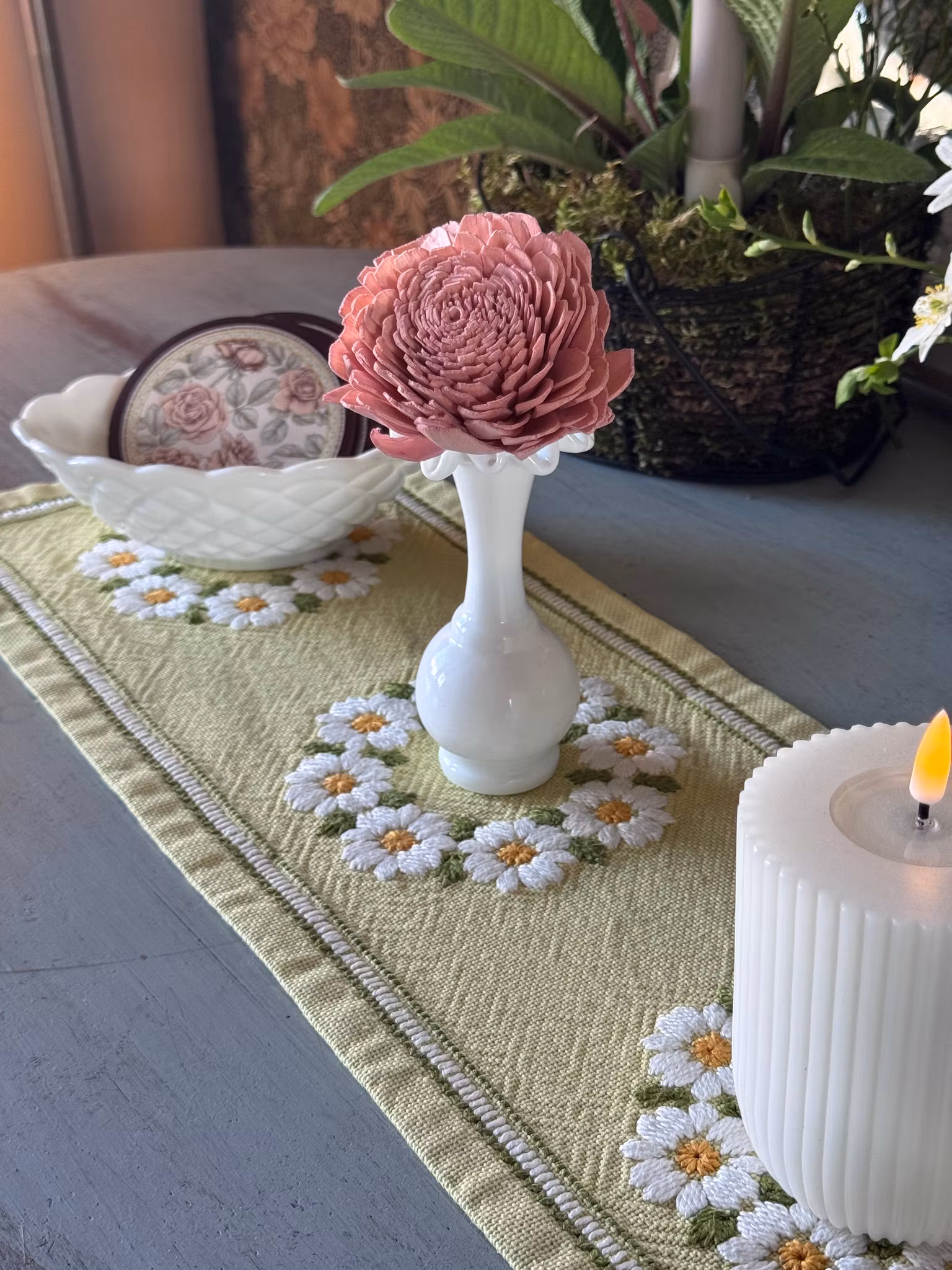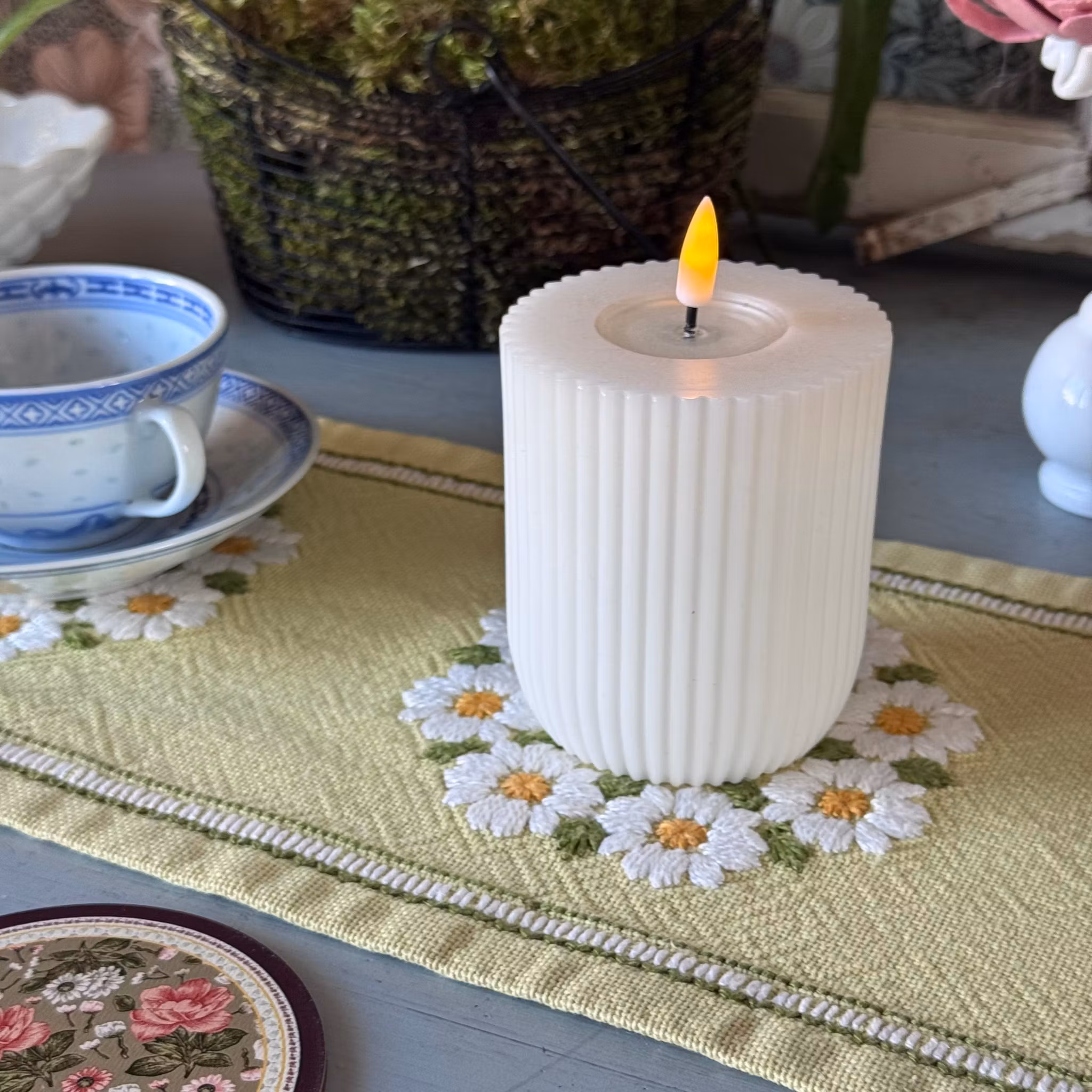 Den här lilla duken i retrostil (Second hand) passar det mindre bordet. Rejält material som blir jättefin till vita detaljer som hämtar upp det vita i duken.