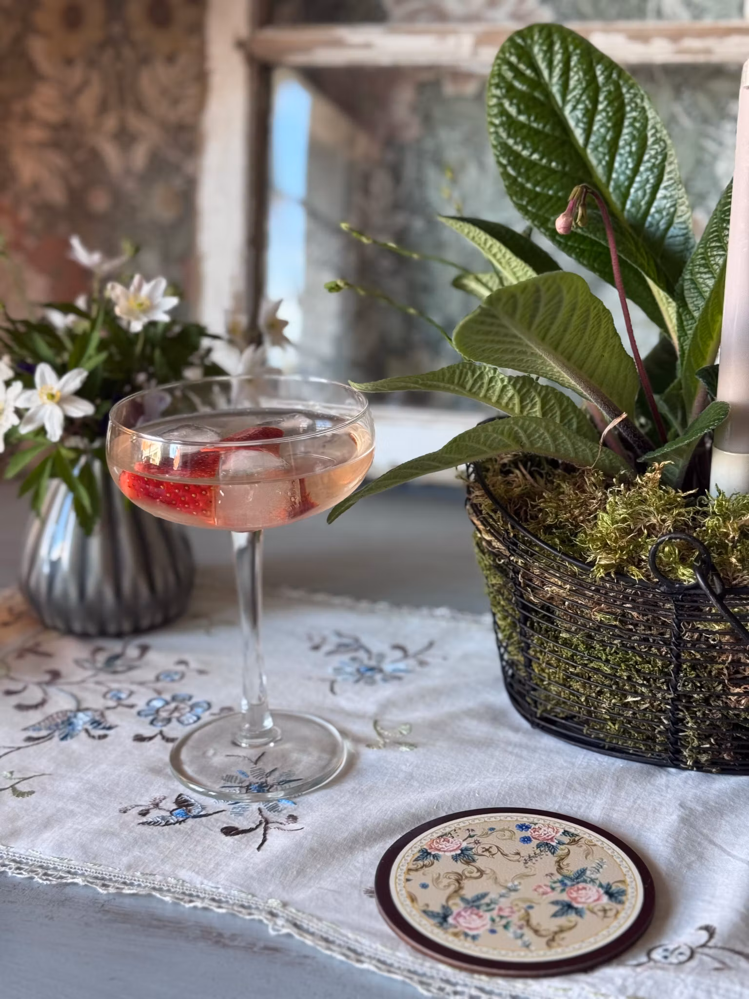 En vacker skir duk med en originell form. Tyget är tunt med vackra blommor i blått. Runt om pryds duken med en smal spetskant. Passar lilla bordet.