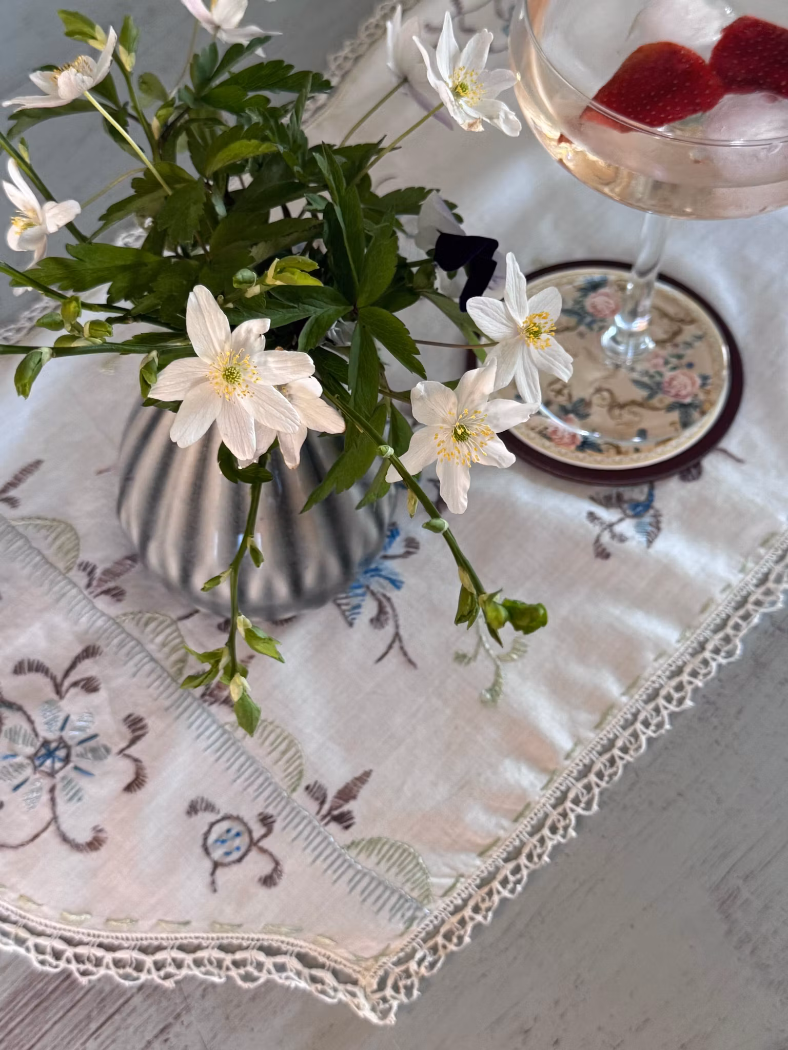 En vacker duk med en originell form. Tyget är tunt med vackra blommor i blått. Runt om pryds duken med en spetskant.