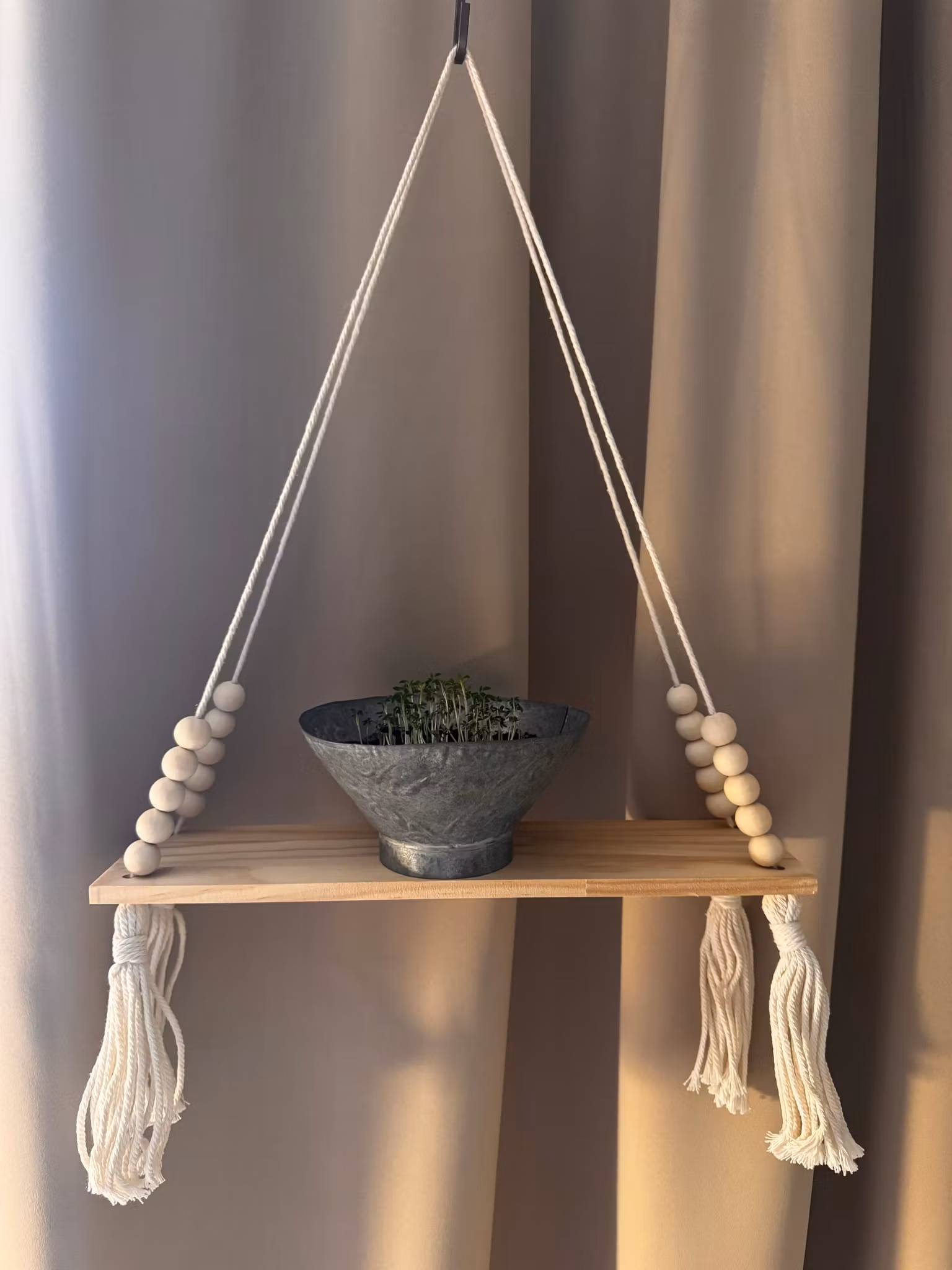 Den här jättefina hängande trähyllan i bohemisk stil blir fin i de allra flesta miljöer. Var den än hängs upp så förgyller den intrycket av lugn och harmoni. Ställ en liten fin grön växt eller ljus (men använd LED-Ljus för brandriskens skull, vi har sådana som passar perfekt).