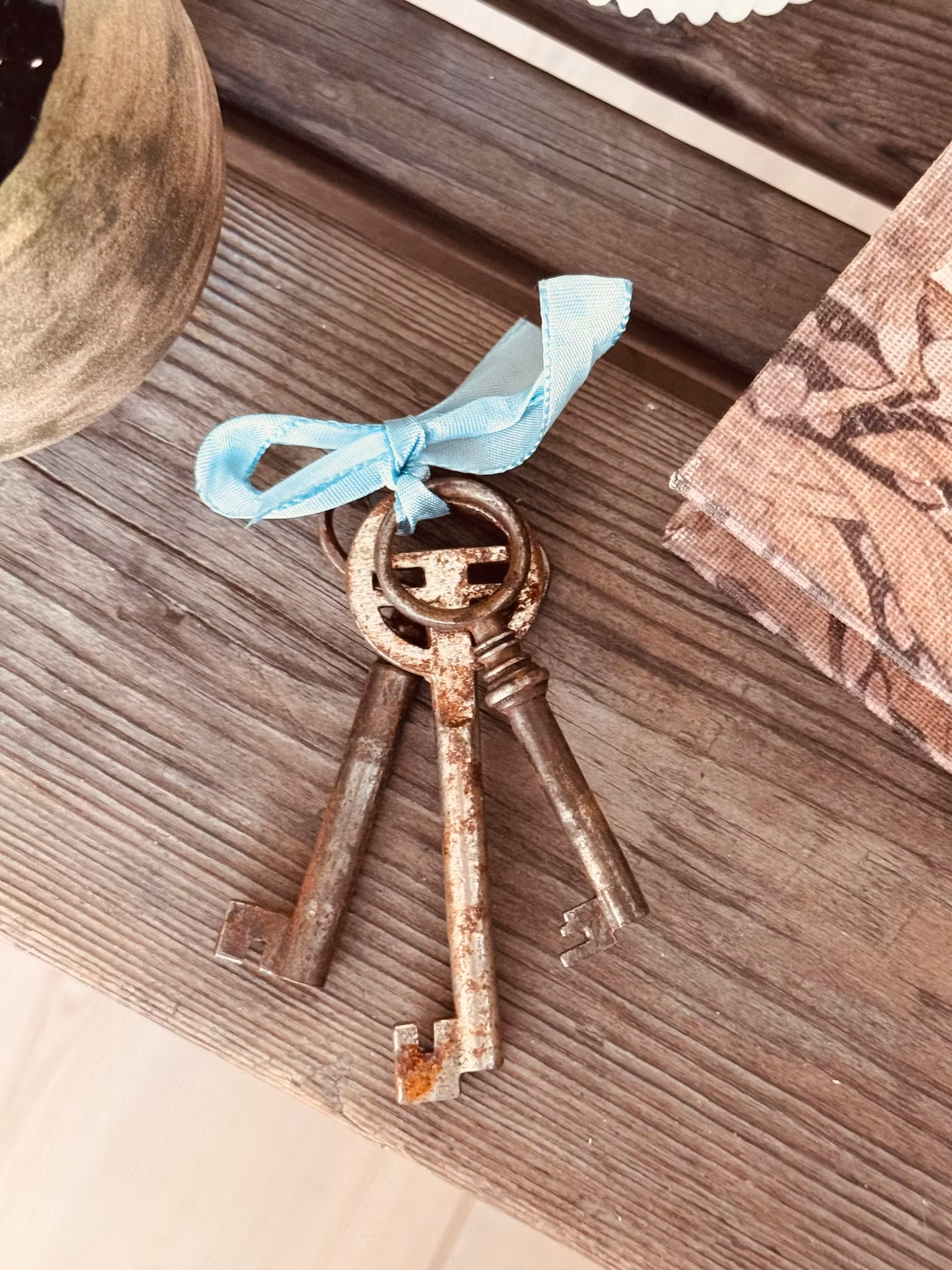 Vi har kommit över de här jättefina äldre lite rostiga nycklarna. Vi älskar dem! Så fina att lägga fram i ett fönster eller hänga på en krok på väggen bara för att de är så ärjade. Rosetten med sidenband gör en tvär kontrast vilket vi tycker är charmigt. Jättefint att låta nycklarna ligga på ett fat i ett fönster eller byrå.
