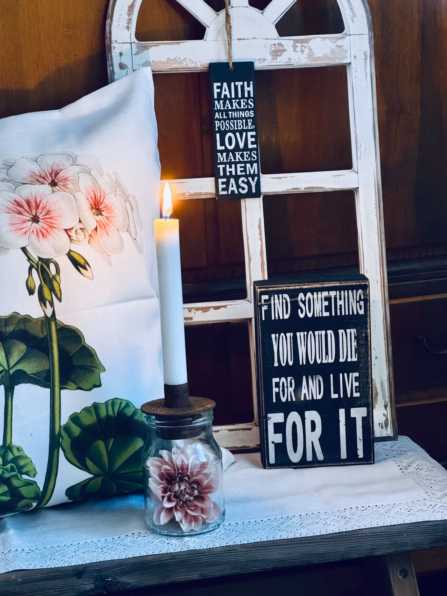 En tavla/inredningsdetalj med fint citat "Find something you would die for an live for it". Går att hänga på väggen på en spik eller ha lutad mot en vägg.