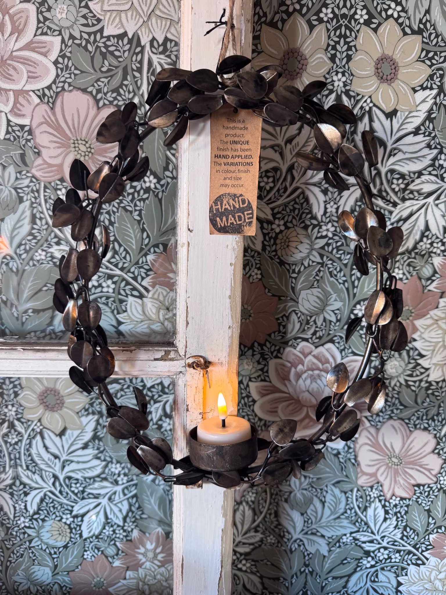 Vackert och dekorativt hängande ljusfat i metall, formad till en lövkrans På väggen eller i ett fönster ger den ett hemtrevligt och varmt uttryck Den passar perfekt till våra Tealight LED-ljus från Deluxe homeart så har du även ett brandsäkert alternativ. Hantera ljuset enkelt och bekvämt med fjärrkontroll som kan köpas till. En fjärr fungerar till flera ljus frpn Deluxe Homeart.