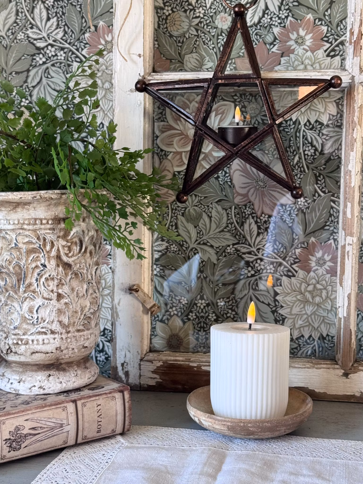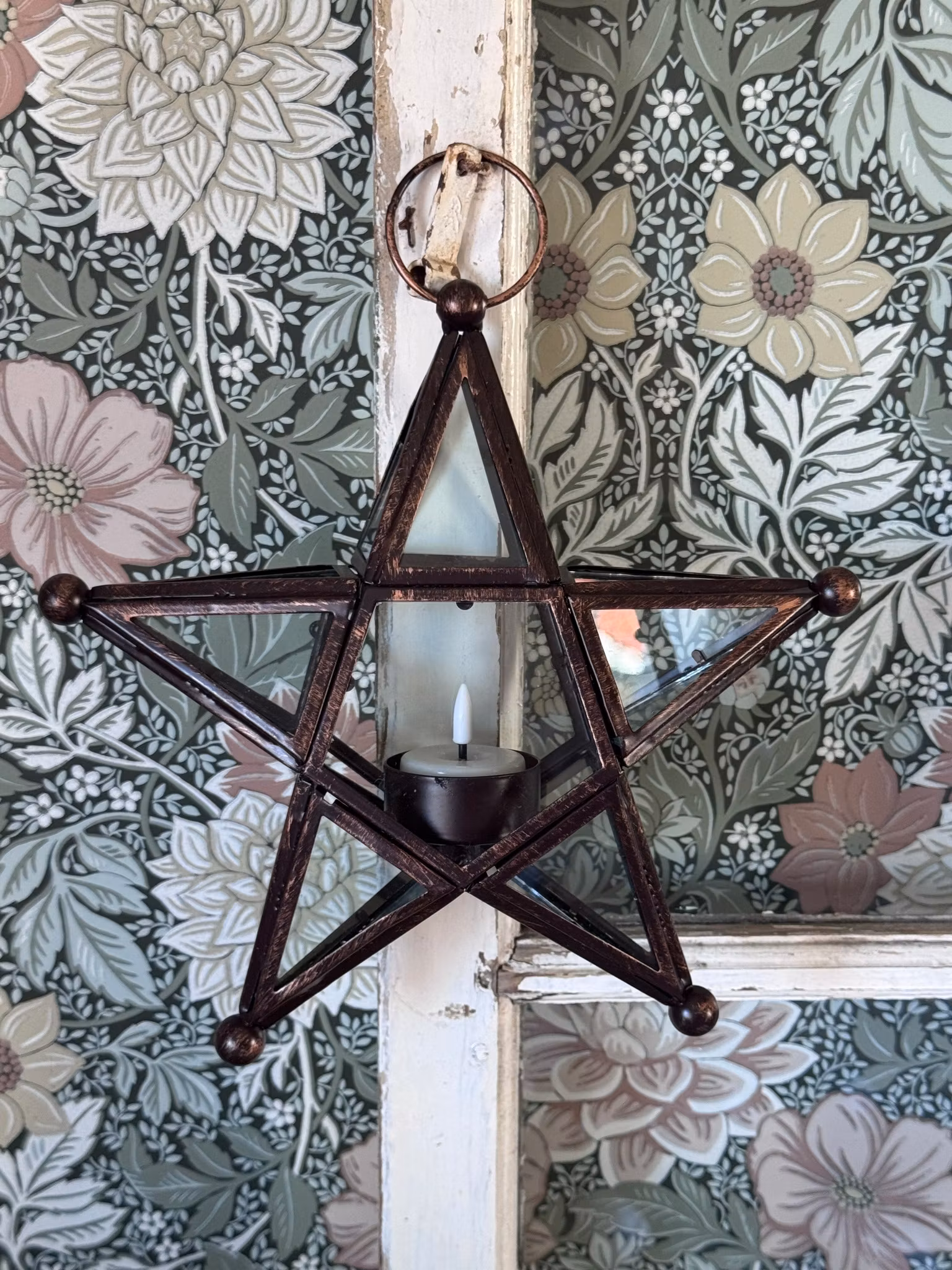 En jättefin och mysig hängande ljushållare (Second hand) som passar alla årstider. Häng upp i ett fönster eller mot en vägg med ett LED-ljus och njut!