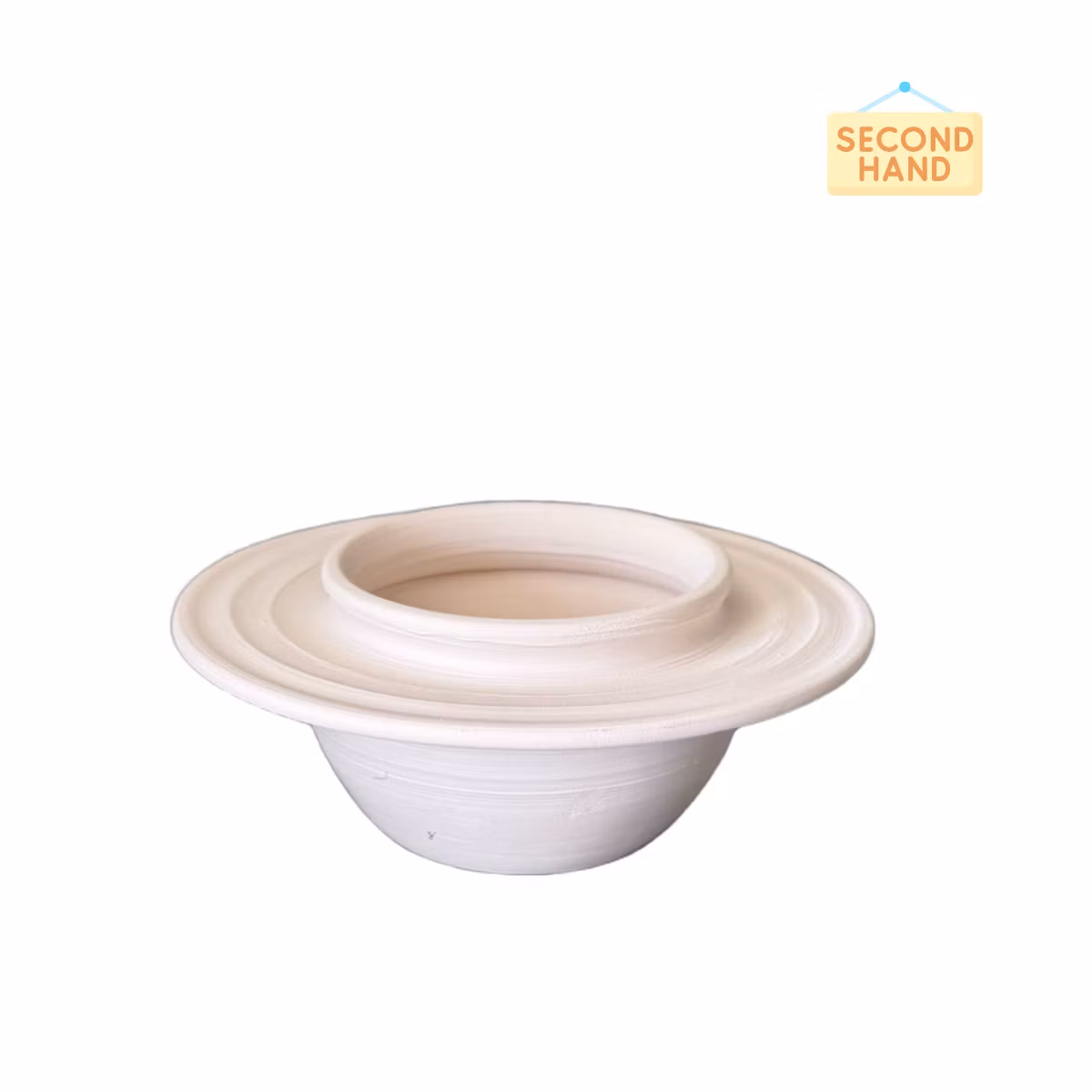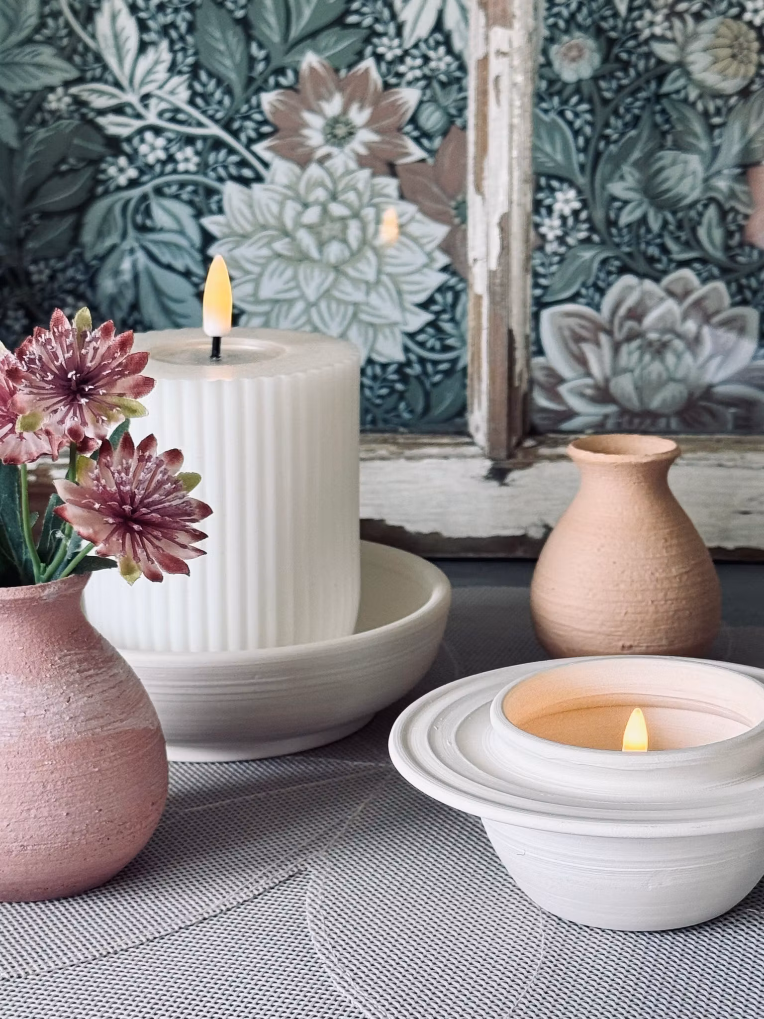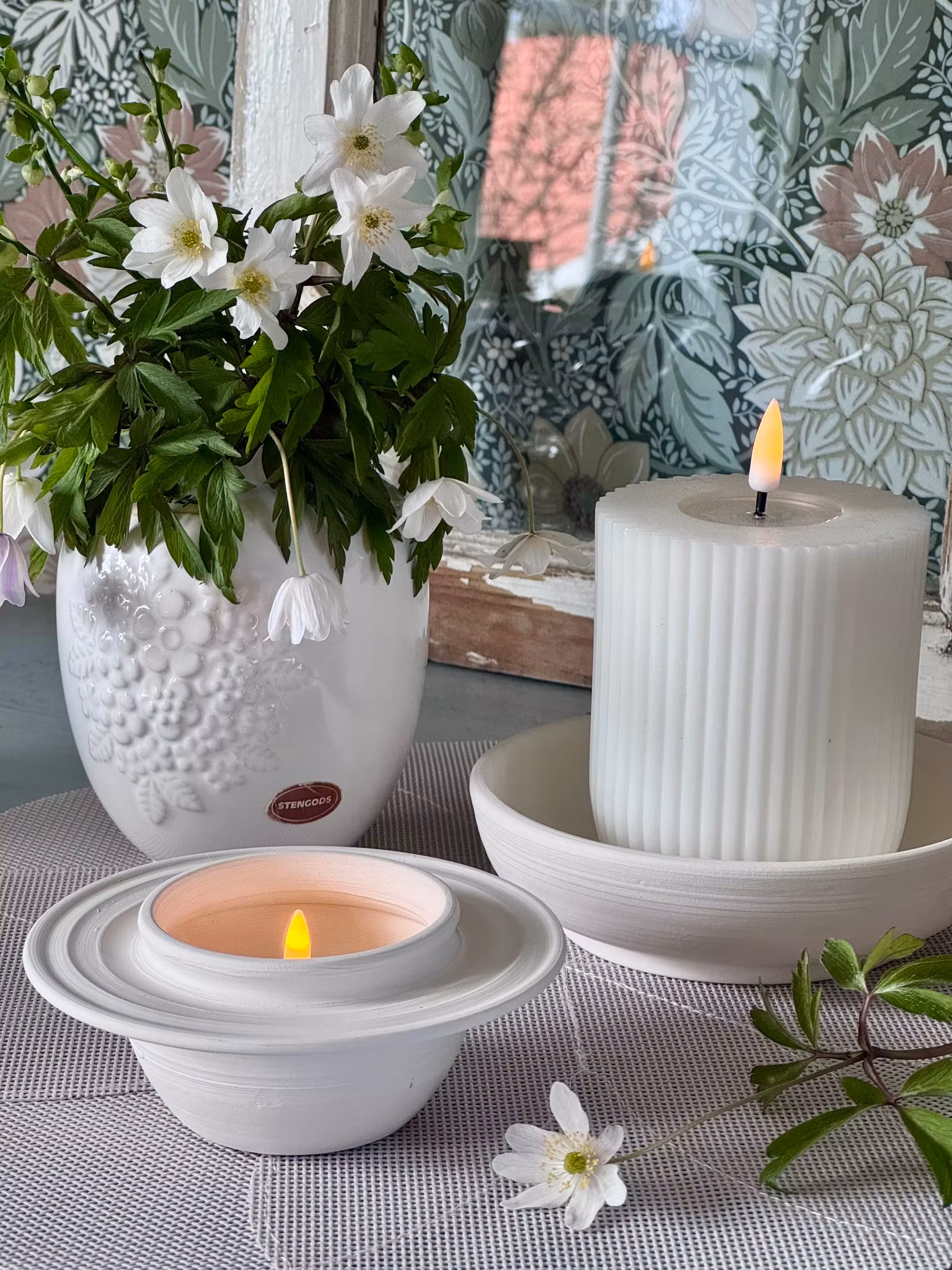En vacker oglaserad ljushållare (Second hand) med dekorativa ränder. Ljuset kommer ner en bit, vilket skapar ett mysigt sken mot keramiken.