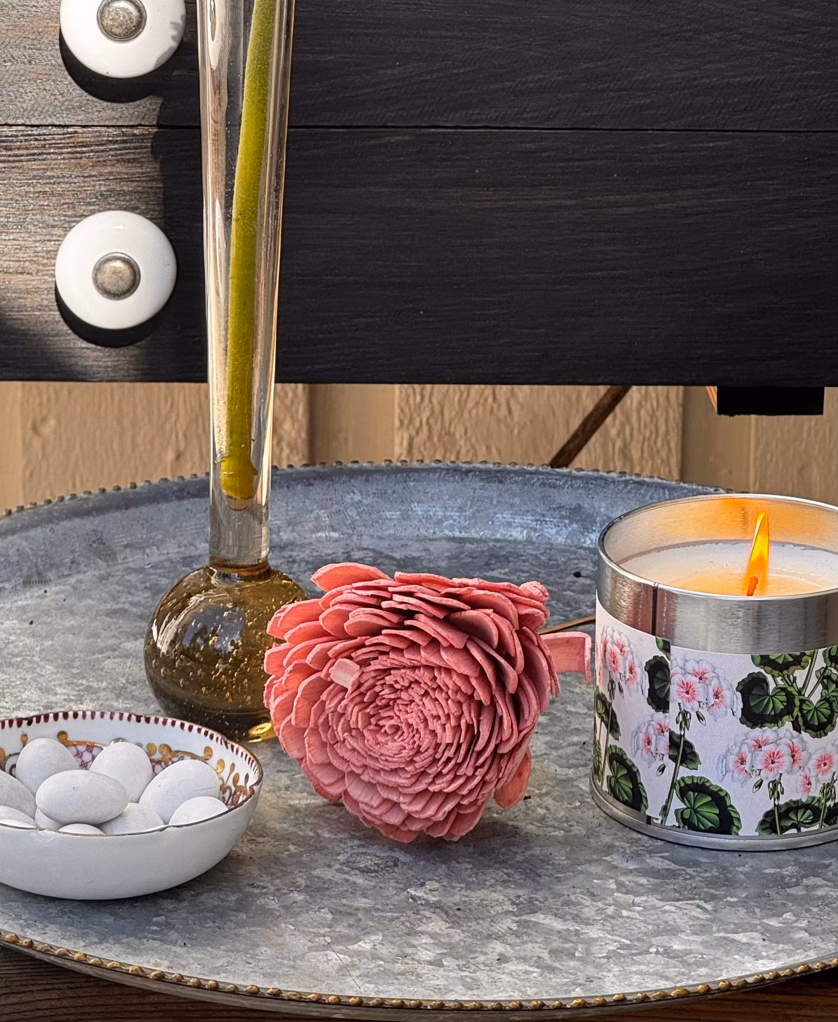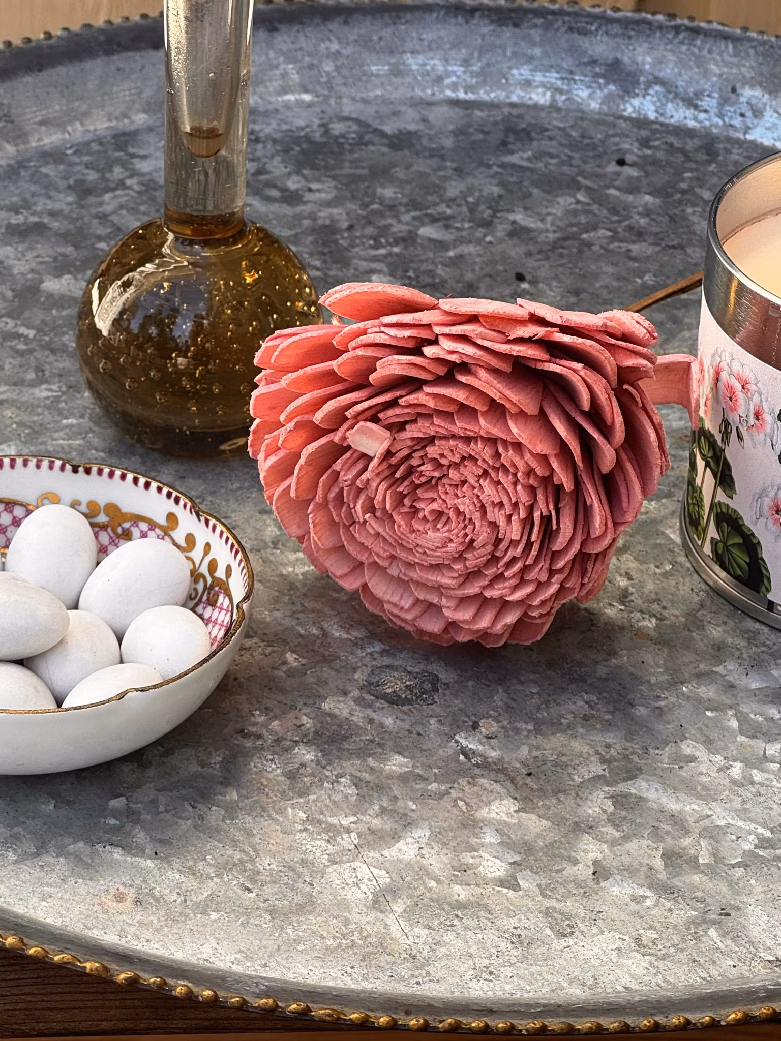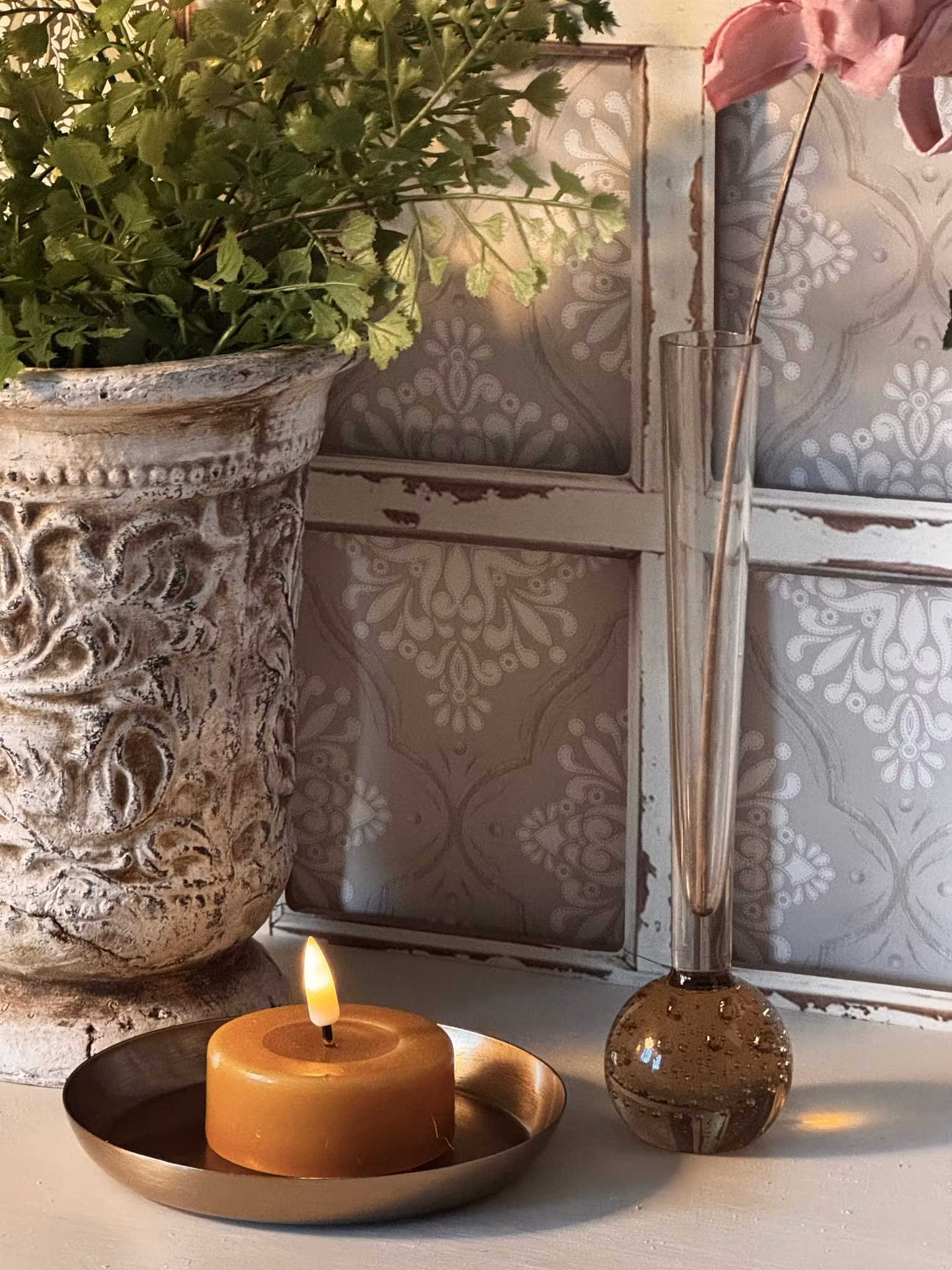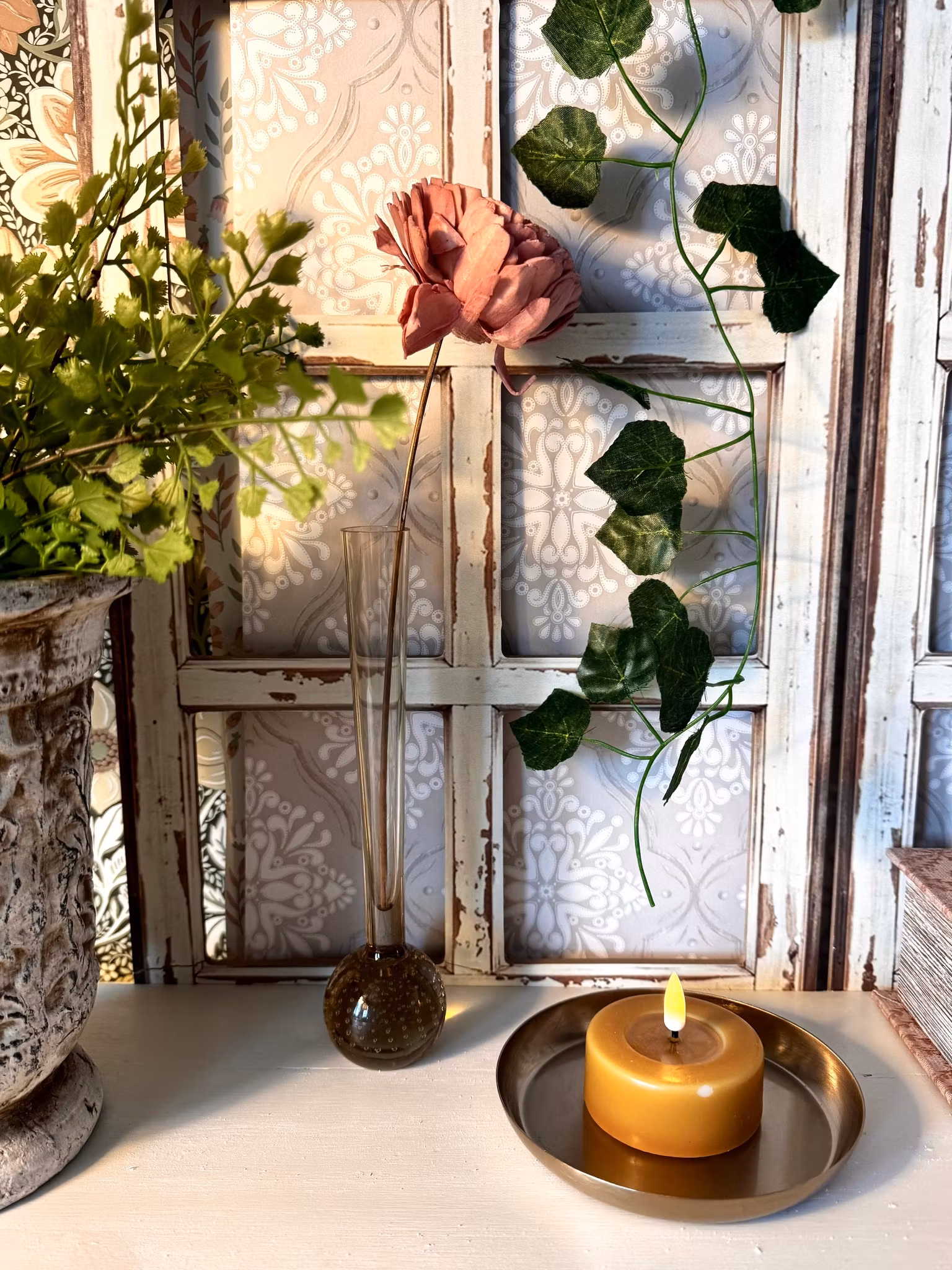 Den här fina vasen får oss att tänka tillbaka till 70-80 talet. Men lika snygg är den fortfarande med sin kula som tyngd med små bubblor i. Färgen är härlig bärnsten. Den här vasen med en enkel blomma på kaffebrickan kommer göra dig glad varje gång.