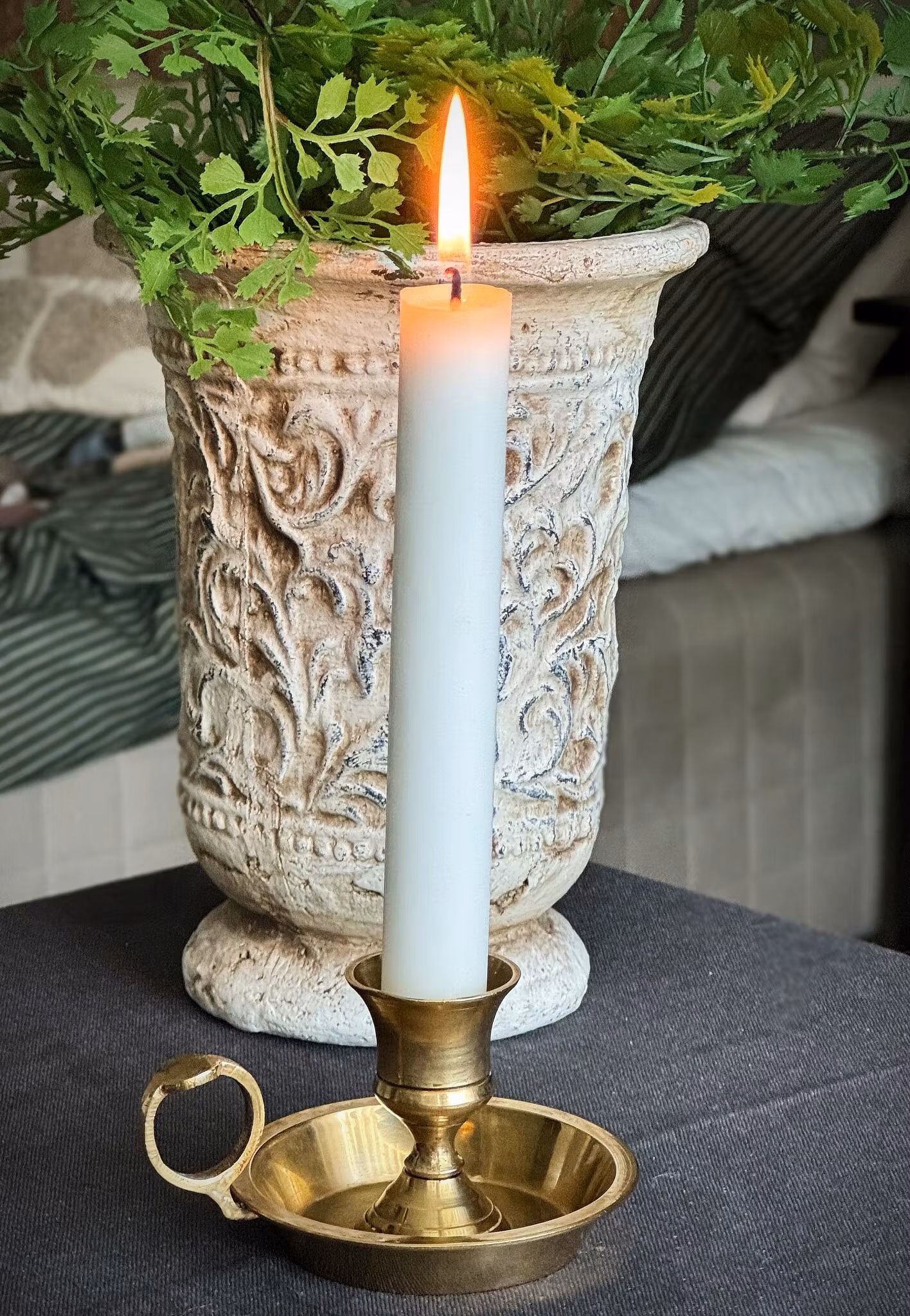 En charmigt ljushållare i mässing, klassiskt låga med litet fat och praktiskt “öra” (second hand). Denna tidlösa design påminner om gamla kammarljusstakar och ger hemmet en nostalgisk och stämningsfull känsla.