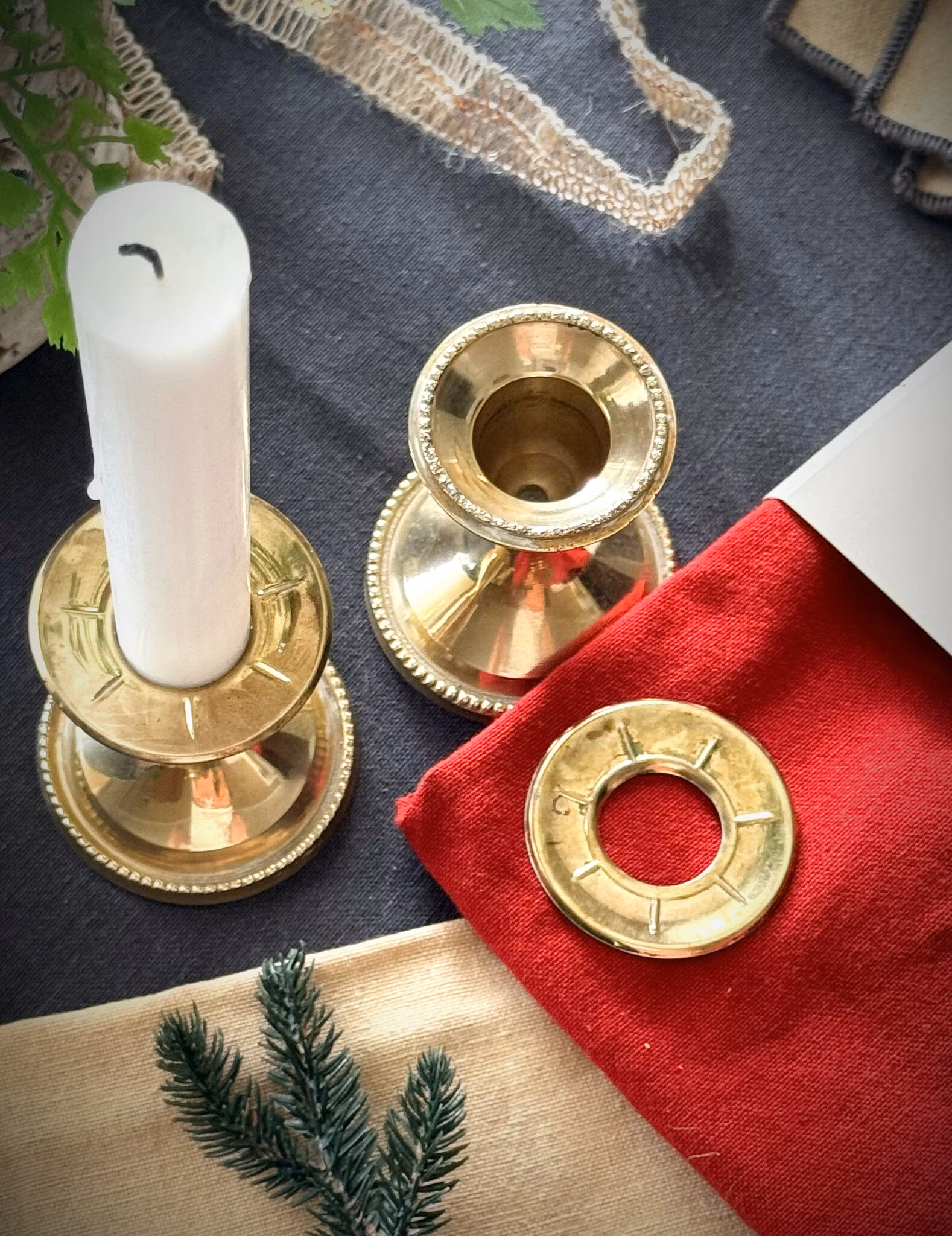 Skapa en varm och inbjudande atmosfär med denna låga ljushållare i mässing (second hand), utformad med en söt, dekorativ kant som fångar och reflekterar ljuset på ett vackert sätt. Den blanka mässingen skimrar fint och ger en elegant känsla, oavsett om du använder den till vardags eller vid festliga dukningar.