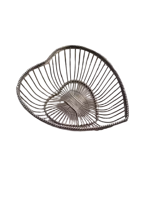 En söt liten skål i form av ett hjärta, tillverkad i stålnät med en dekorativ kant som ger ett lekfullt och charmigt uttryck. Den unika designen gör den lika fin som prydnad som den är praktisk.