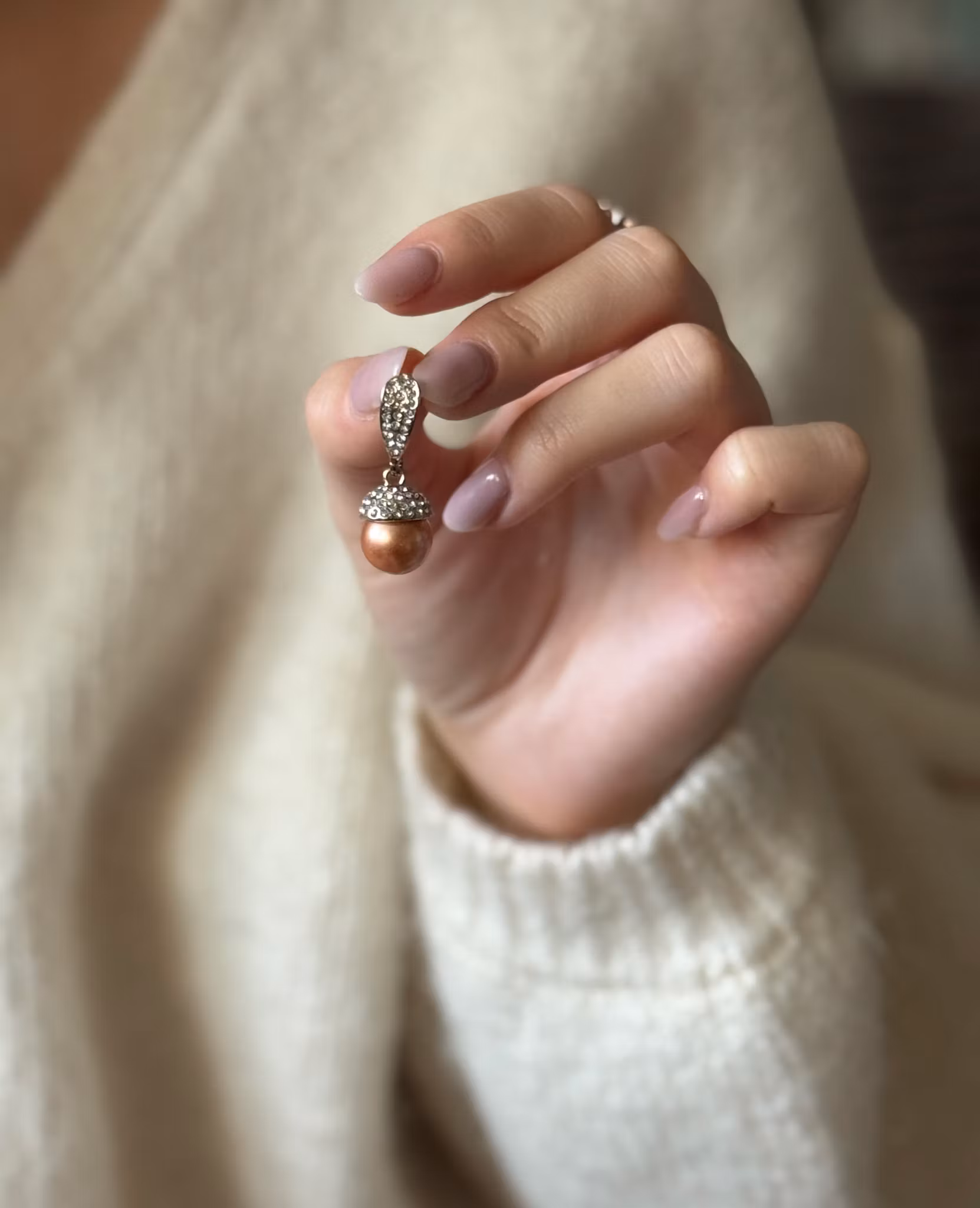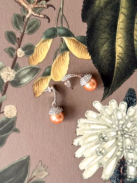 De här örhängena blir festens snackis och ögonmagnet! Så vackra och glittrande och påminner om ett ekollon. Pärlan är persikofärgad med en touch av pärlemor. Massor av strassliknande pärlor runt om gör att örhängena gnistrar vackert. De är perfekta för fest, nyår, julfirande eller varför inte lyfta upp en vardagsoutfit.