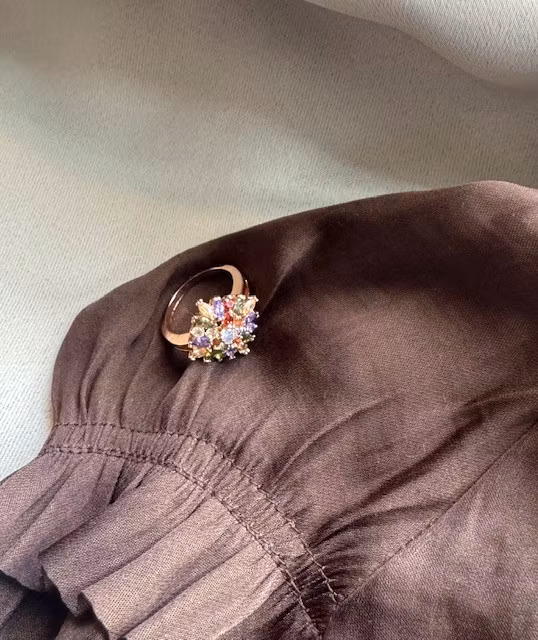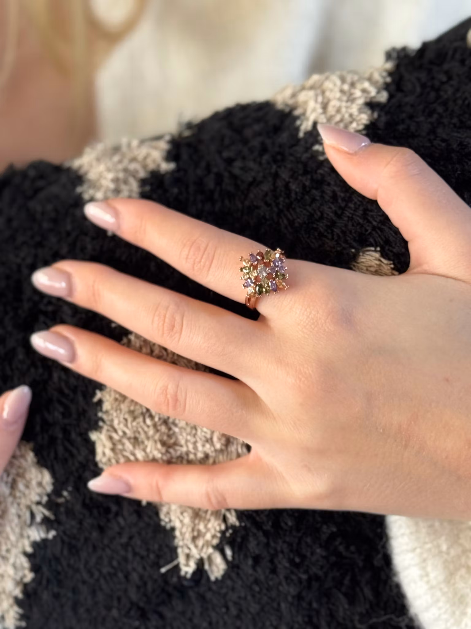 Ringen som garanterat fångar ögat. Roséfärgad ring med ett hav av gnistrande stenar i olika nyanser. Ett smycke som kombinerar lekfull färg med tidlös elegans.