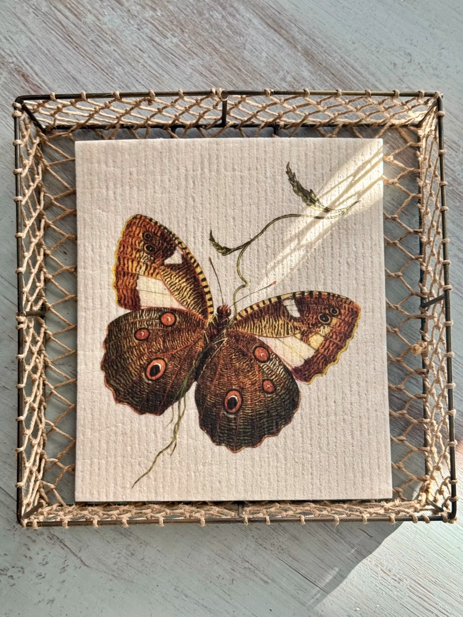 Miljövänlig kökstrasa med vackert tryck av en fjäril. Den är 100% naturlig och biologiskt nedbrytbar. Med det trevliga trycket blir den dekorativ detalj på diskbänken och vardagen blir med ens lite lyxigare. Det här är också den perfekta gå-bort presenten tillsammans med några ljus eller servetter.