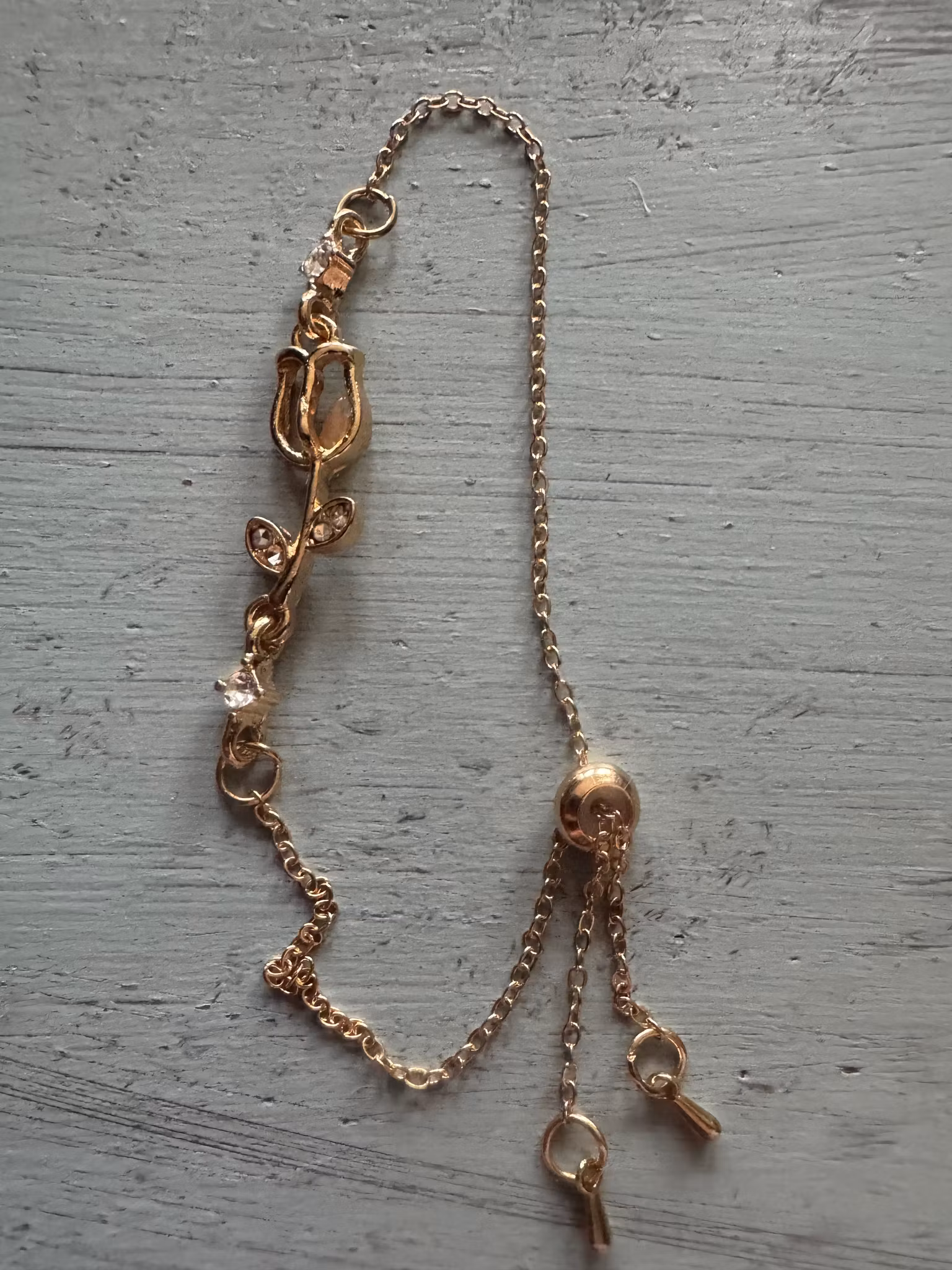 Sött guldfärgat armband med motiv av en tulpan. Ett armband som du kan använda såväl till vardags som fest. Smart är att det är justerbart i storlek och enkelt att reglera storlek på medan armbandet sitter på.