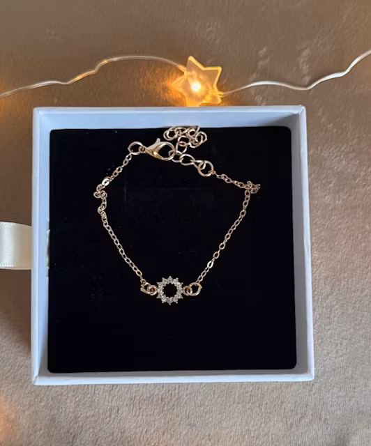 Ett vackert och feminint armband i guldplätering med en liten blomma av skimrande stenar mitt på.