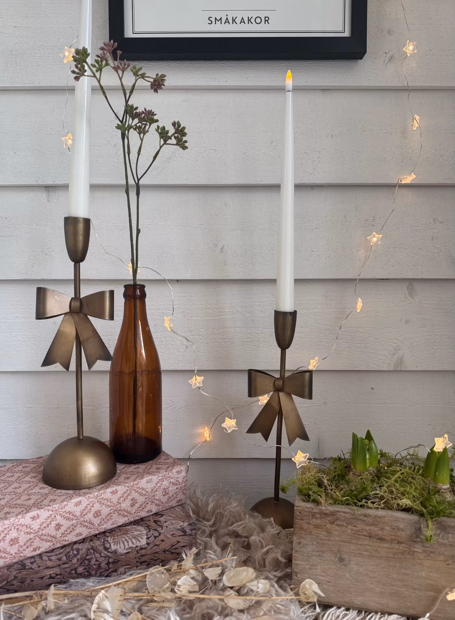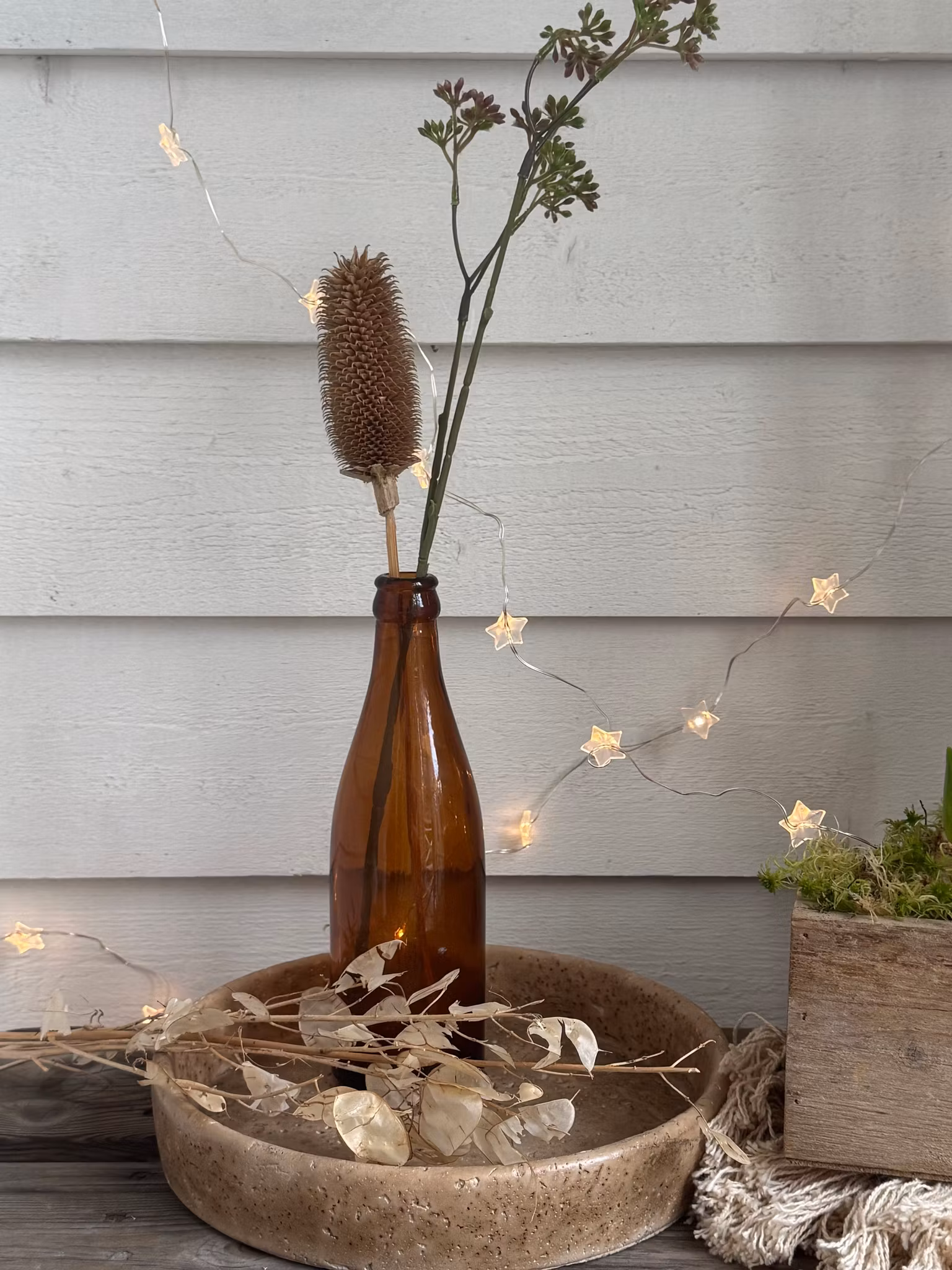 Flaskvas i klassiskt apoteksbrunt glas - en vacker inredningsdetalj som blir otroligt dekorativ på ett bord med grön kvist.