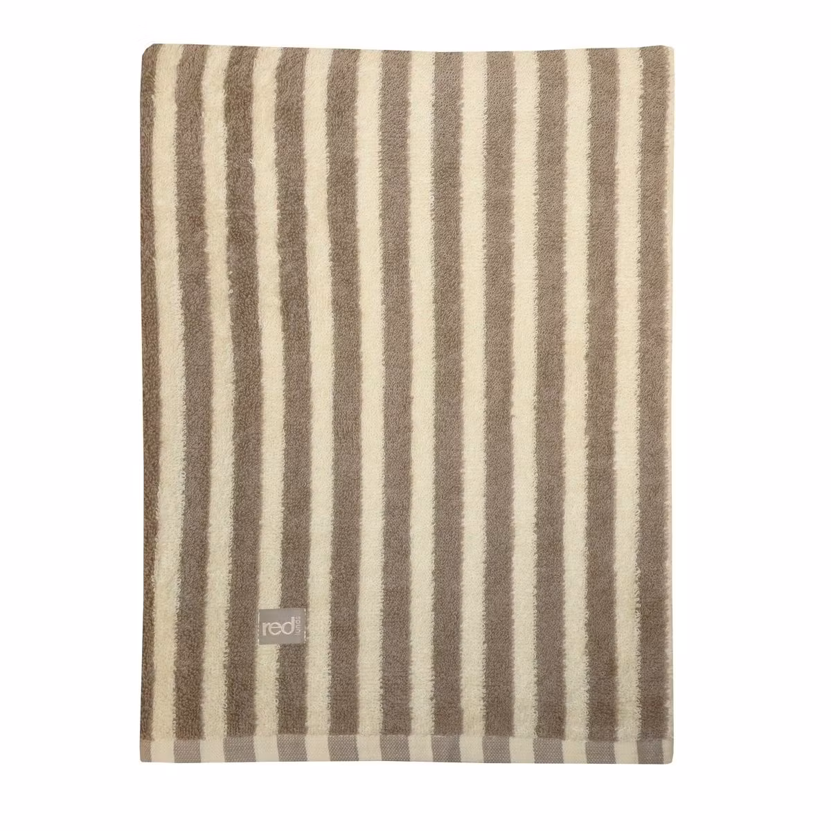 En mjuk och slitstark frottéhandduk i tidlöst beige- och vitrandigt mönster. Den klassiska designen gör att den passar lika bra i badrummet som i husbil eller husvagn.