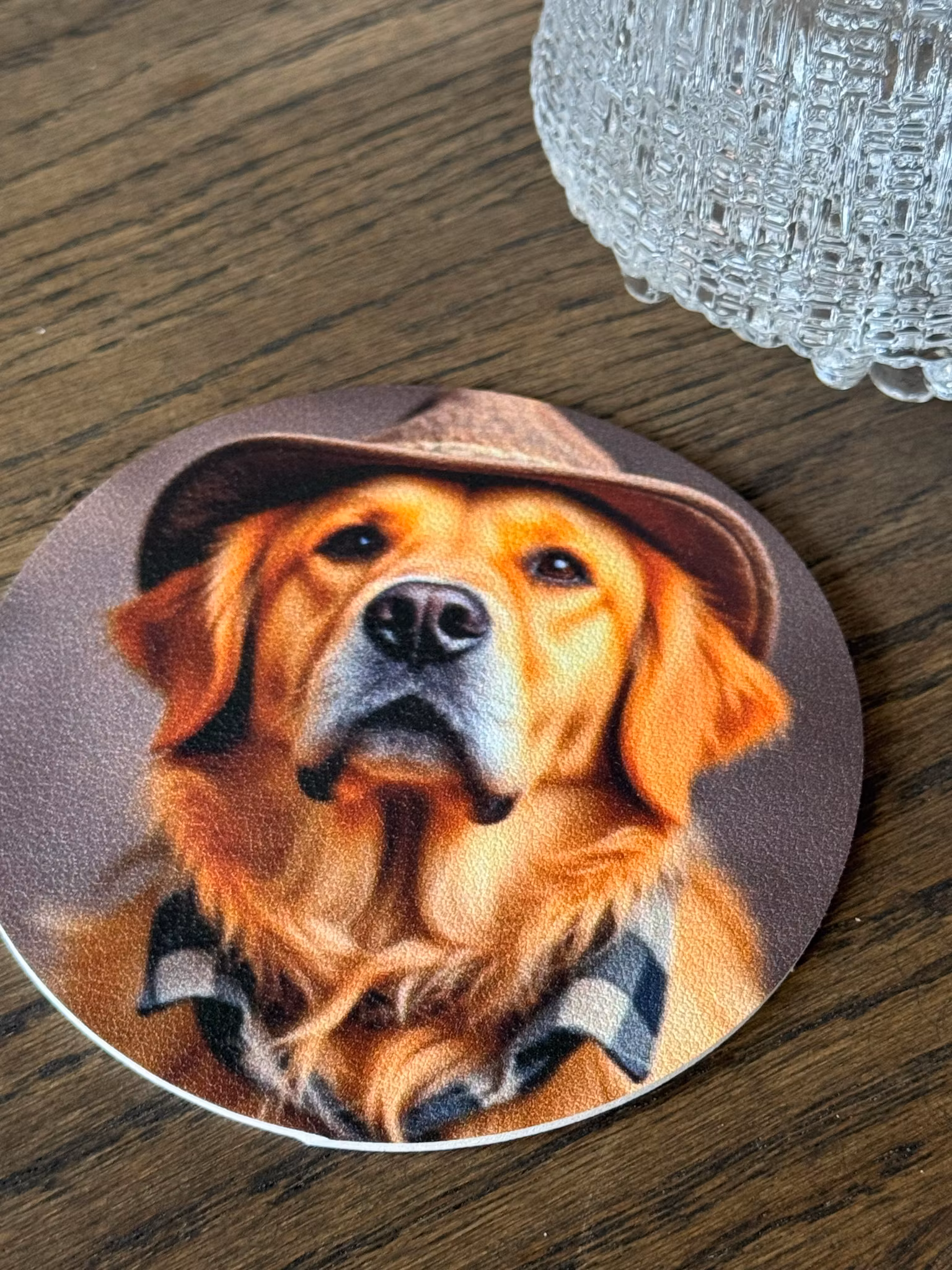 Motiv: Hund Goldie. Storlek: 10 cm i diameter. Glasunderläggen kommer i en svart pappersask med fönsterlock. Säljes styckvis för att kunna mixa olika motiv.