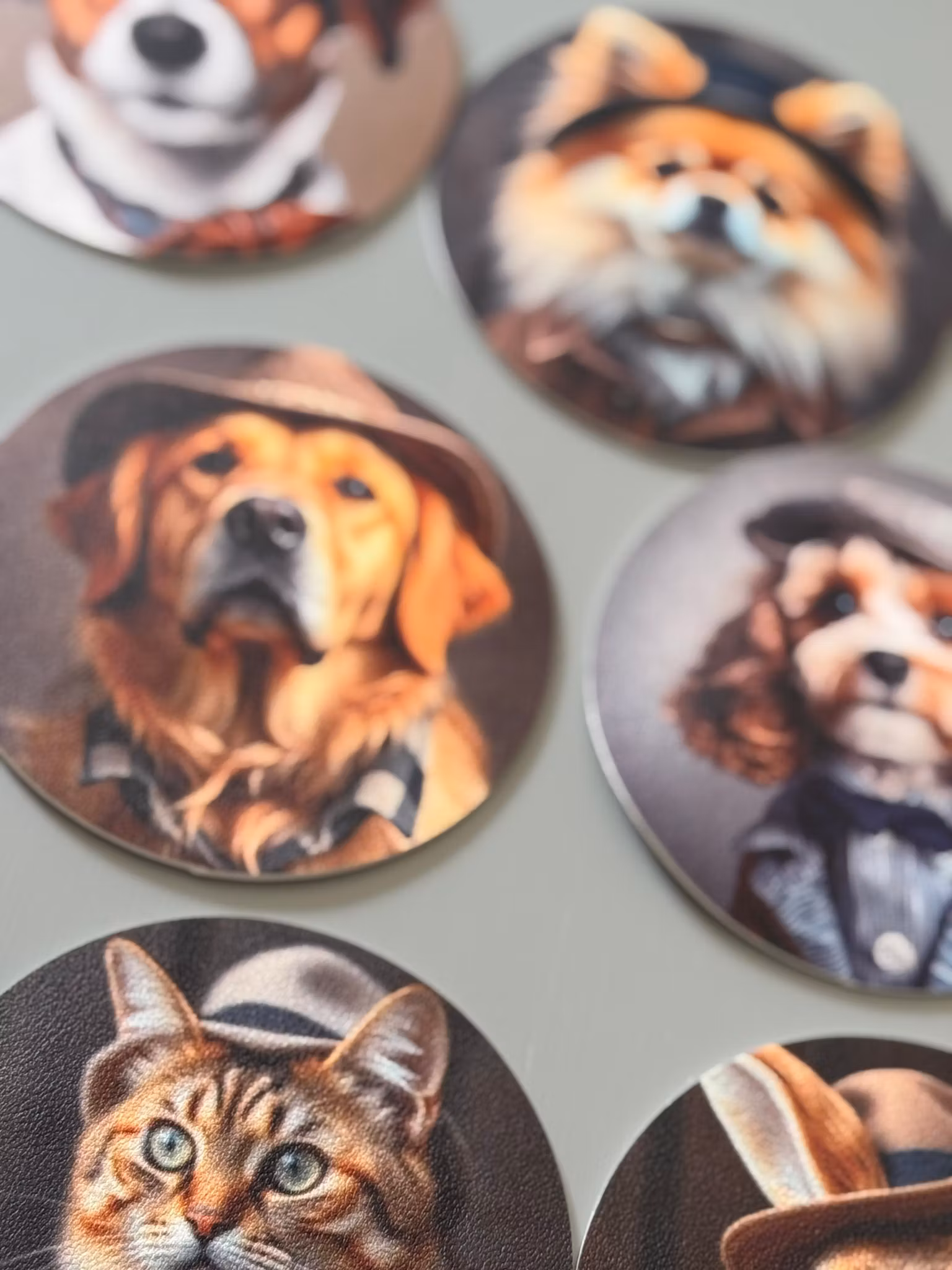 Skydda bordet med stil – och ett leende! Våra glasunderlägg i konstläder kombinerar praktisk funktion med charmig design. Varje underlägg pryds av unika tryck föreställande eleganta hundar, nyfikna katter och bedårande kaniner – alla avbildade i en klassisk, gammaldags stil med en humoristisk twist.