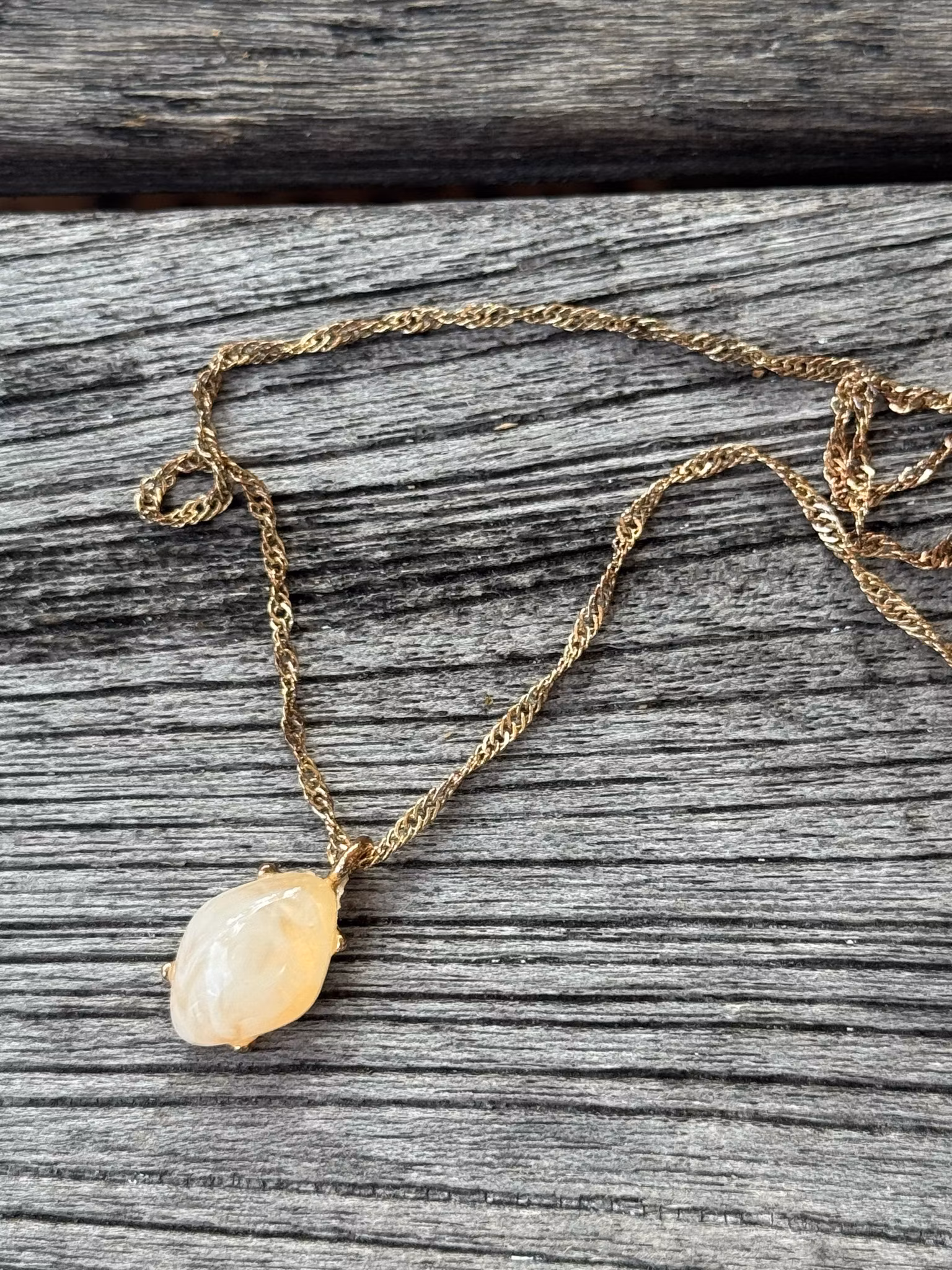 Romantiskt och användbart guldfärgat halsband (second hand) med en berlock i ljus pärlemor-sten. Den guldfärgade kedjan är tvistad, vilket ger ett härligt och l