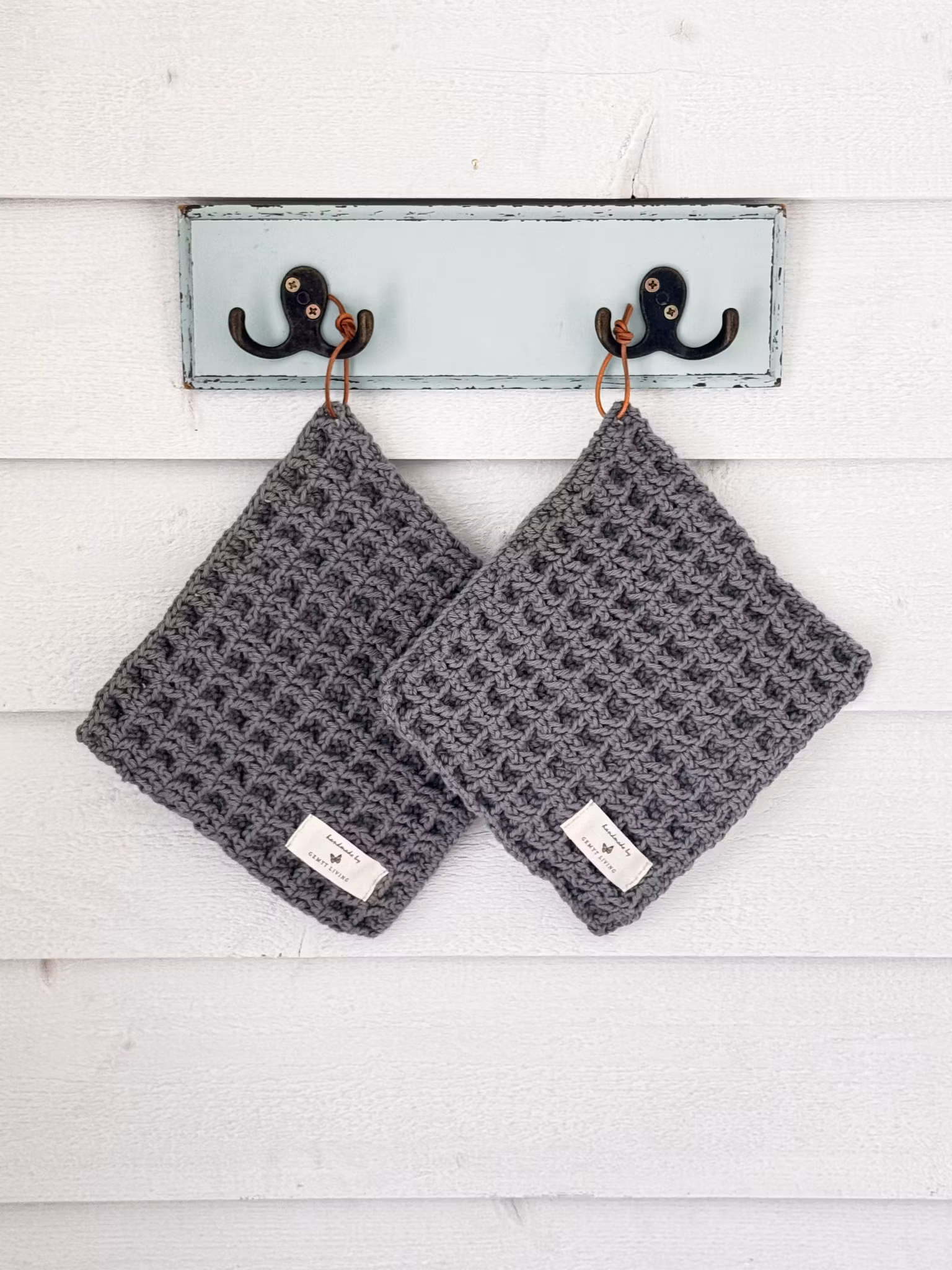 Vackra och funktionella handvirkade grytlappar med voffelmönster. Läderögla att hänga i. Tillverkade med kärlek och omsorg. Finns i två exemplar, säljs styckvis.