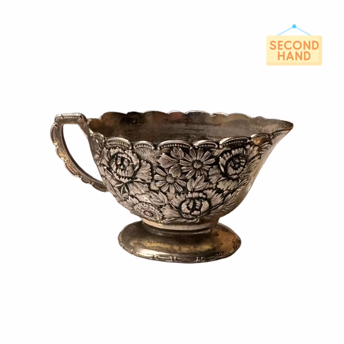 Grädd- eller mjölkkanna i nysilver. Söt dekor i gammaldags stil. Kanske har den gjort sitt på kaffebordet? Men vi tycker att man kan leka lite med föremål och förvandlade den till en liten minikruka. Blir en otroligt söt detalj på bordet. Till våren kan man sätta små violer i den som en annorlunda och rolig detalj. Endast fantasin sätter gränser!