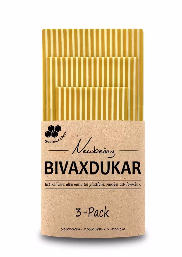 Trött på plastfolie som bara används en gång och sedan hamnar i soporna? Bivaxdukarna från Newbeing är ett snyggt, hållbart och naturligt alternativ som gör vardagen både enklare och mer miljövänlig. Perfekt för att svepa in ost, grönsaker eller bröd. Bivaxet har naturligt antibakteriella egenskaper och låter maten andas, vilket gör att den inte blir svettig eller torr. Slipp engångsplast! Våra bivaxdukar är tillverkade i Västerås av naturliga råvaror, vilket minskar plastavfallet i hemmet och din påverkan på planeten. Använd, skölj av och använd igen! Tvätta dukarna i kallt/ljummet vatten med lite diskmedel och låt dem lufttorka.