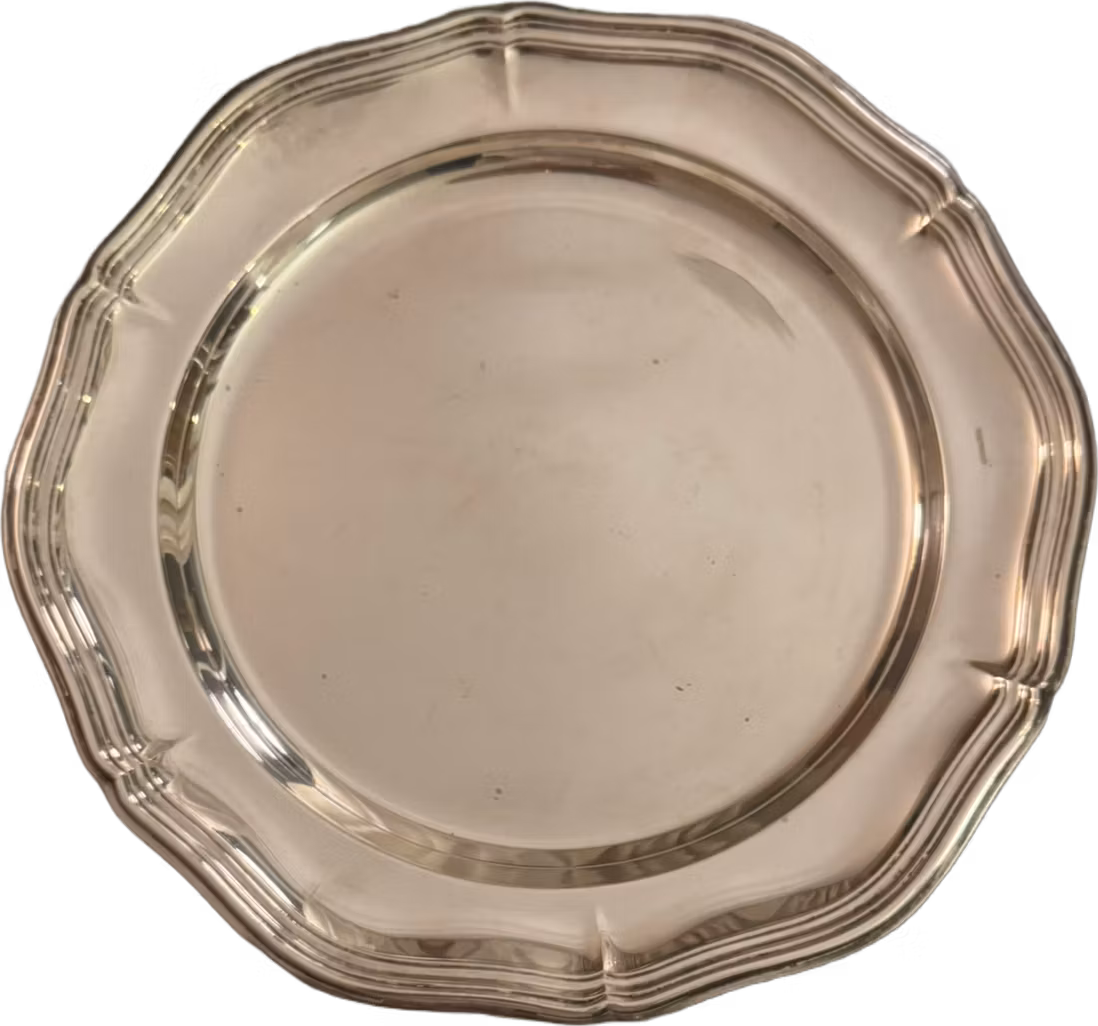 Vackert fat i nysilver. Använd som ljusfat eller serveringsfat. Fatet är ett nyputsat second hand fynd. Storlek: 26 cm i diameter.