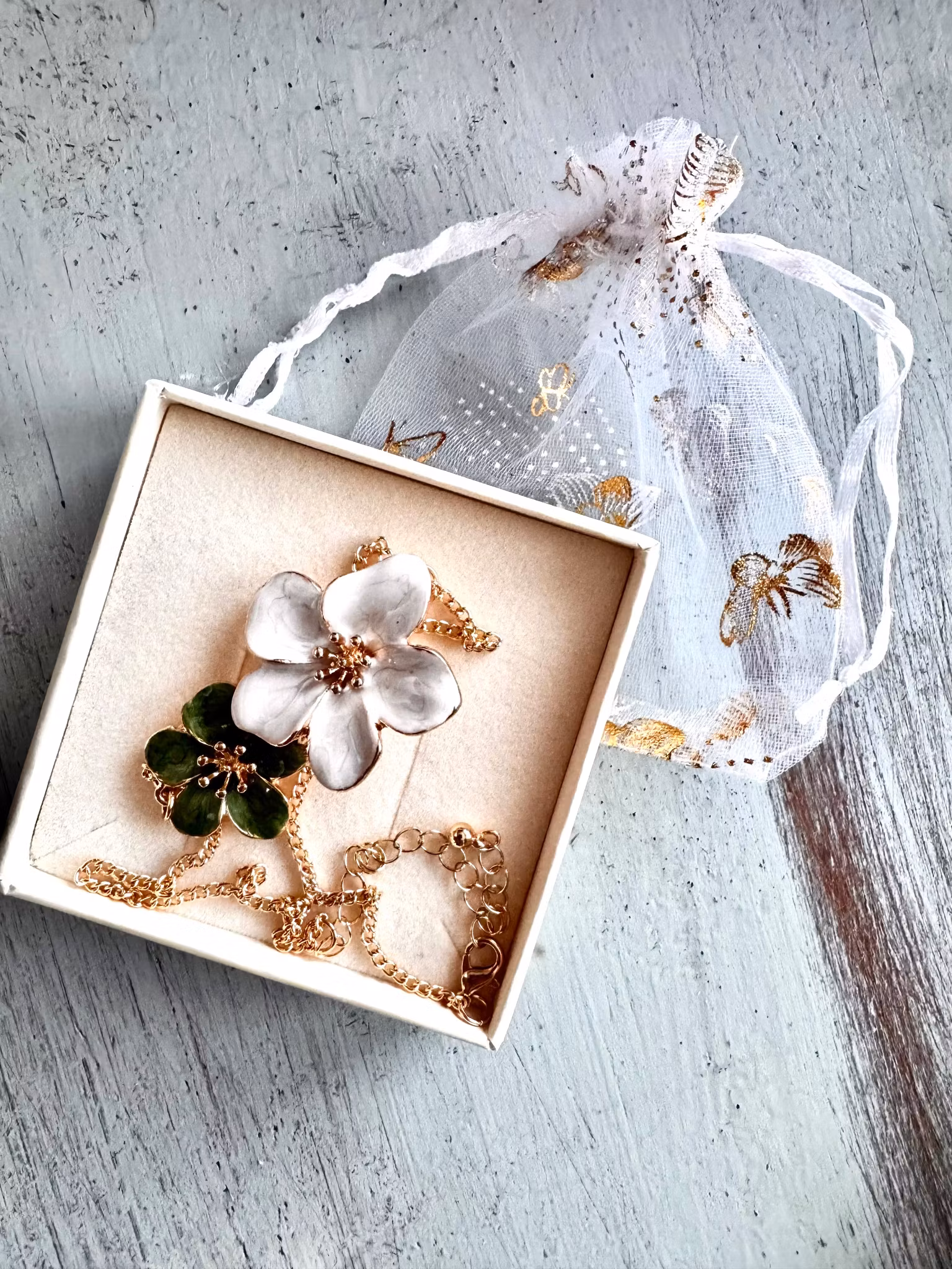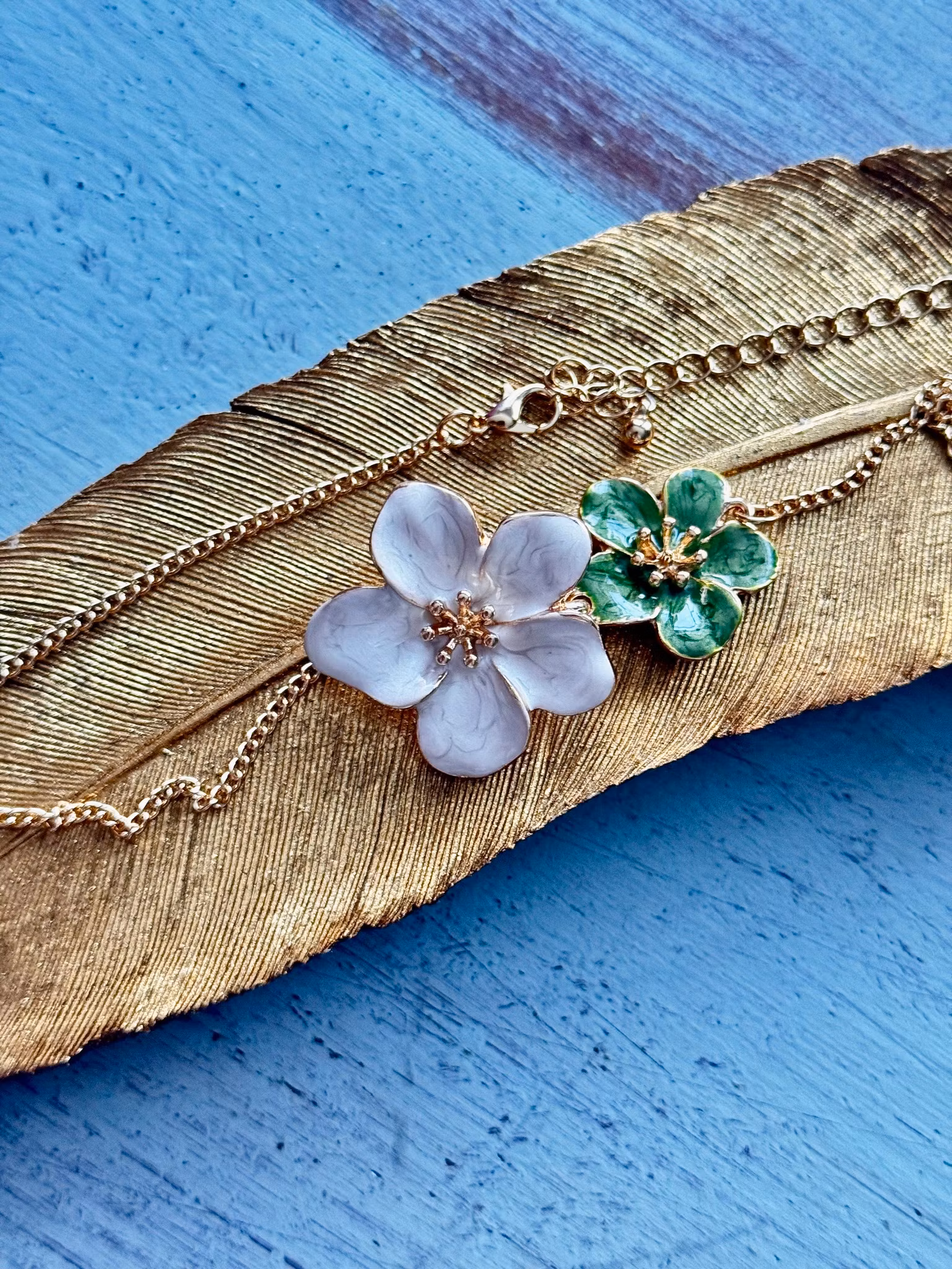 Vackert guldfärgat halsband med två större blommor, ena grön och andra vit. Det här halsbandet kommer du garanterat få positiva kommentarer kring. Ett halsband för dig att älska länge!.