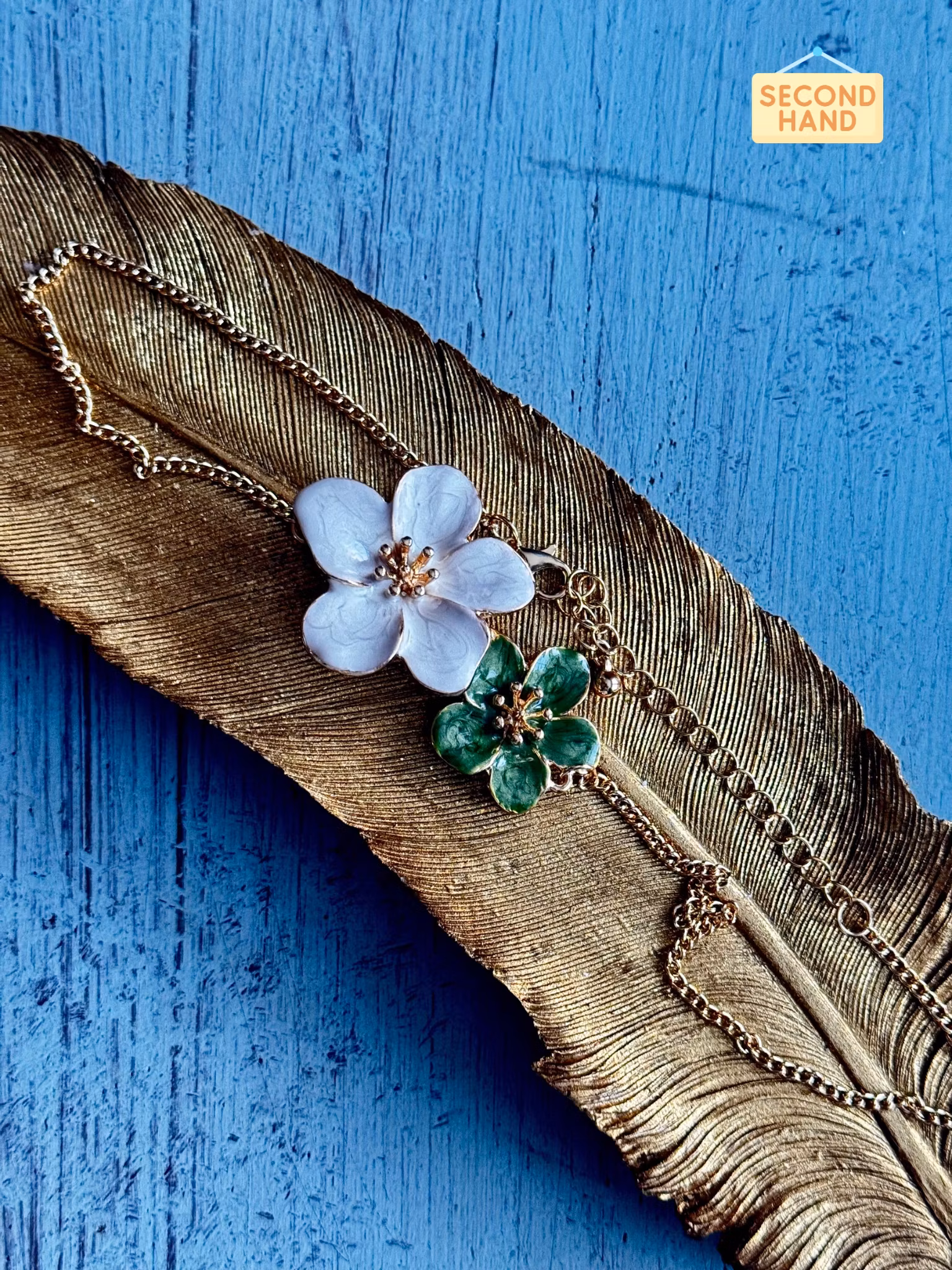 Vackert guldfärgat halsband (Second hand) med två större blommor, ena grön och andra vit.