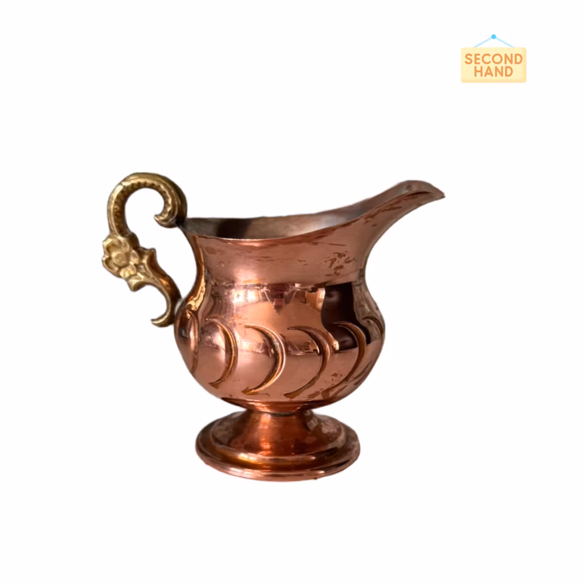 Grädd- eller mjölkkanna i koppar. Söt dekor i gammaldags stil. Nyputsad och grundligt rengjord. Trots det finns det lite patina kvar inuti kannan som är svår att få bort. Om du inte vill använda den till mjölk eller grädde så kan den bli en jättefin dekoration på en lantlig hylla eller på ett bord. Vi brukar tycka det är lite roligt att sätta ner blommor i sådana här söta små detaljer, till exempel småvioler eller snödroppe. Endast fantasin sätter gränser! Finns även som skål under kategori "Skålar".