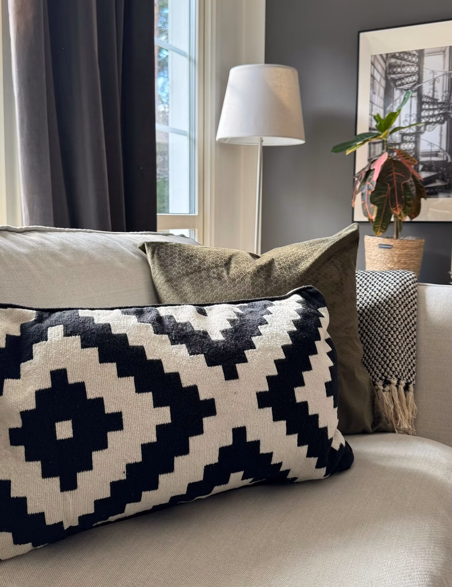 Snyggt kuddfodral i liggande form. Perfekt i soffa eller säng. Med sina sobra färger i svart och vitt blir den enkel att matcha med filtar, påslakan mm.
