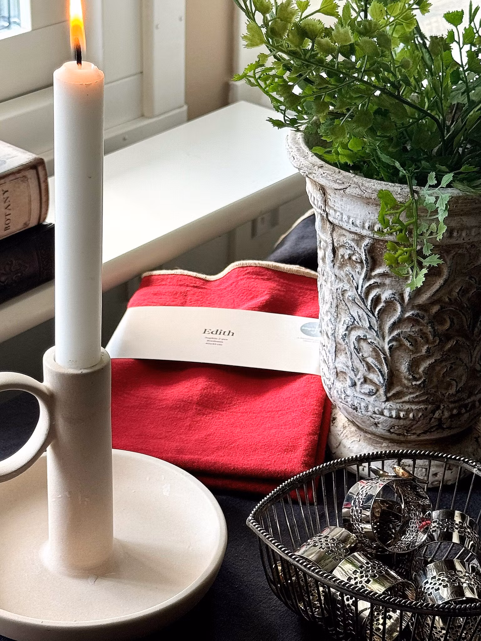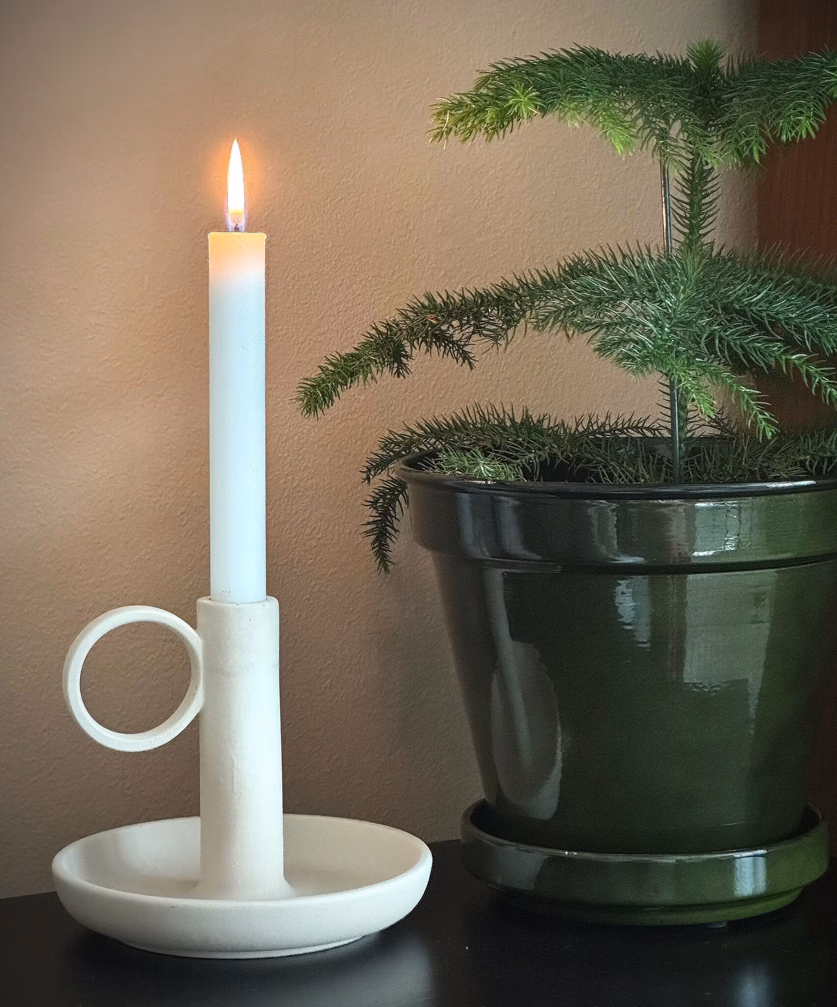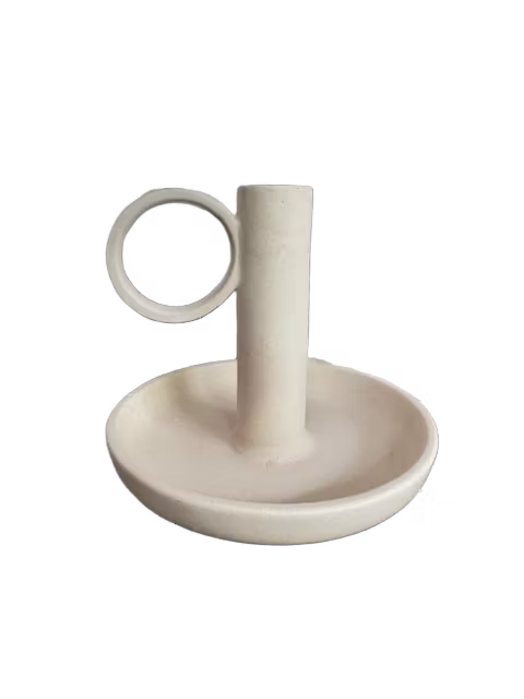 En charmig ljushållare i keramik i varm beige ton. Ljushållaren har ett klassiskt öra och sitter fast i ett tillhörande fat, vilket gör den både praktisk och dekorativ. Fatet ger möjlighet att skapa personliga arrangemang efter säsong – till jul kan du lägga mossa eller små kottar, till våren kanske några blommor eller påskdekorationer.