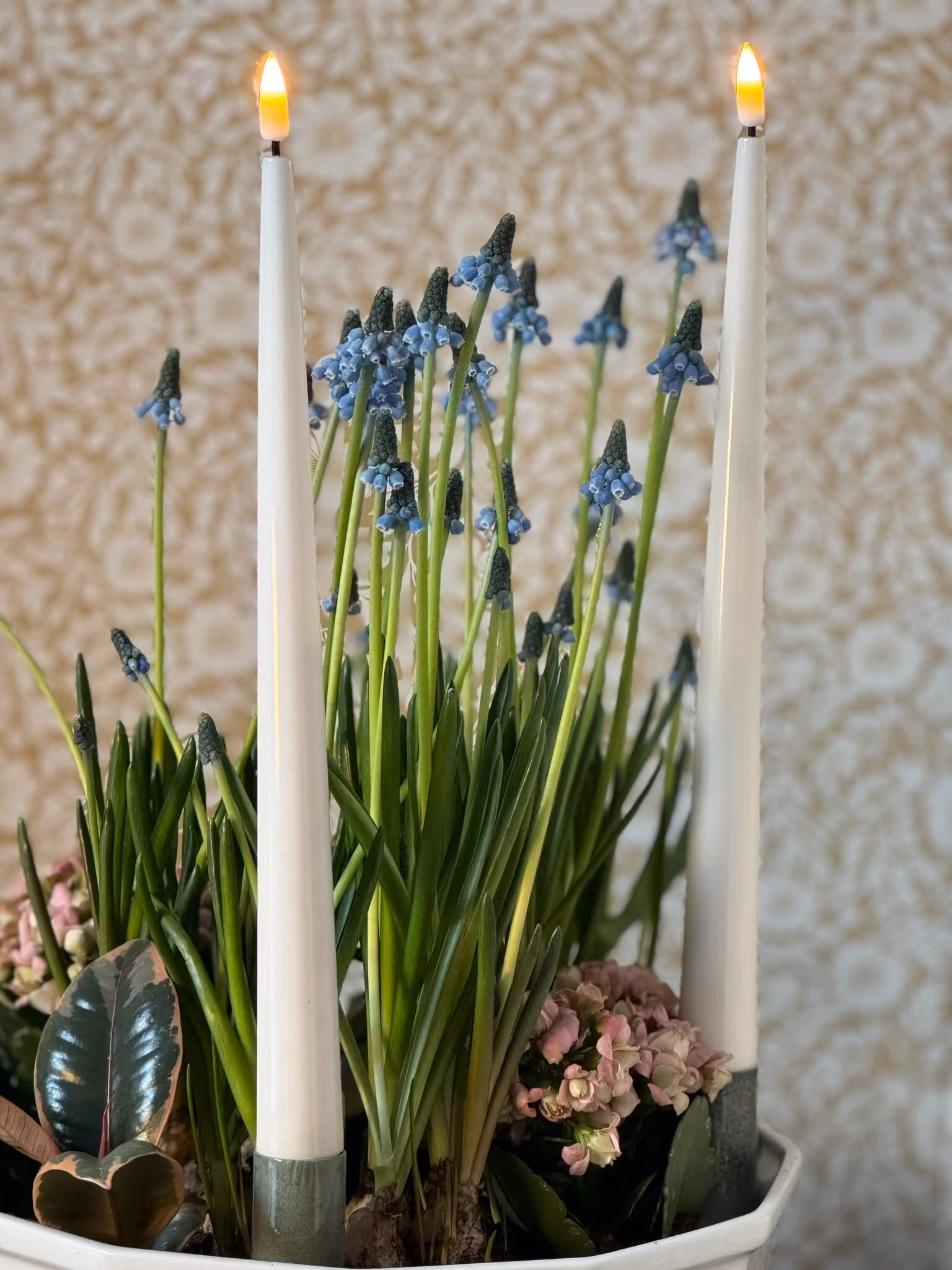 Ljushållare i metall med vacker grön färg. Sätt enkelt ned dem i ett blomsterarrangemang och få en extra dekorativ och mysig känsla. Med LED-ljus blir det extra tryggt och säkert.