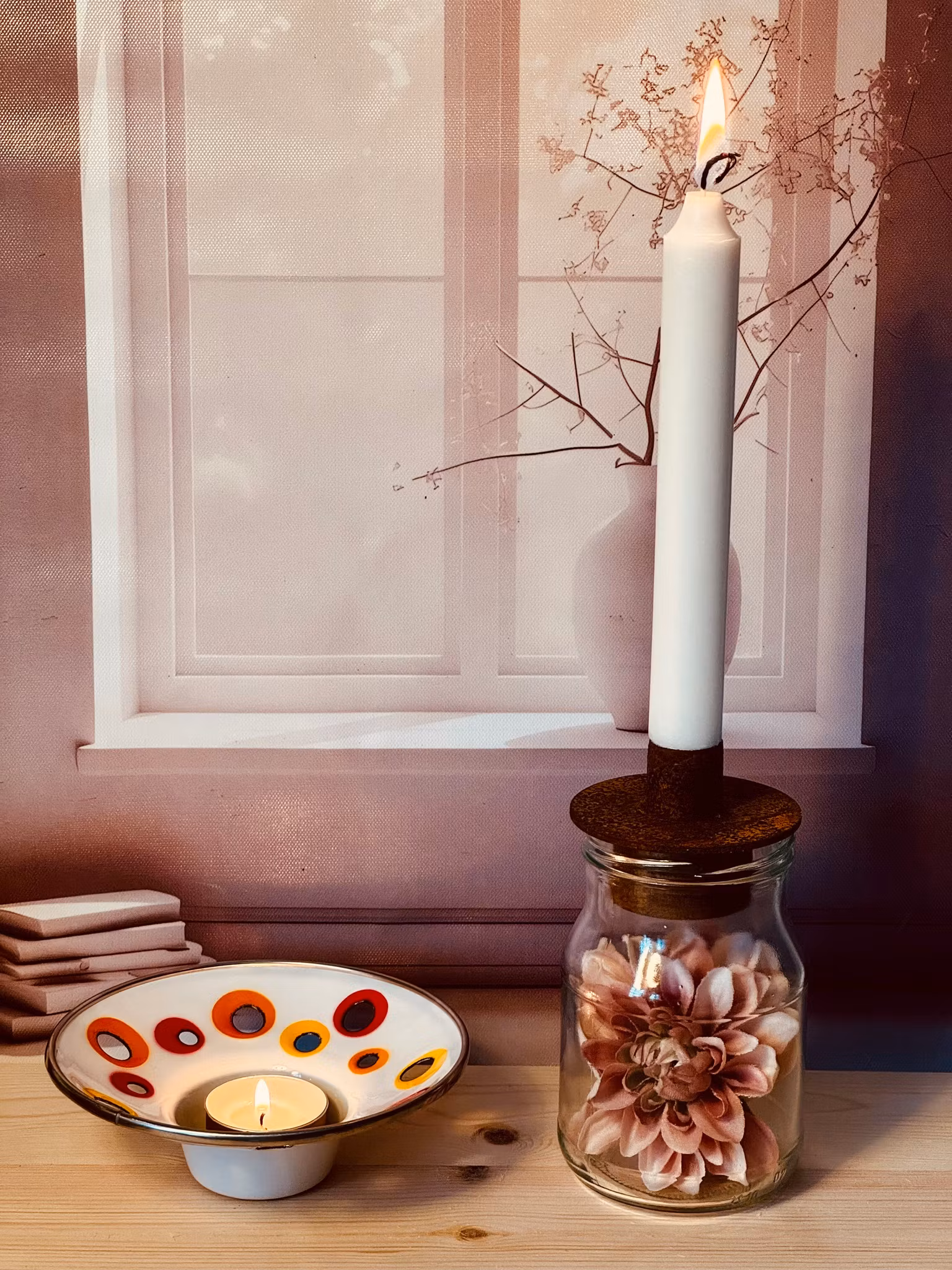 Ett finurligt ekipage av ljushållare i järn som har rostat och glasburk som tillsammans bildar en vacker ljushållare som kan dekoreras. Second hand.