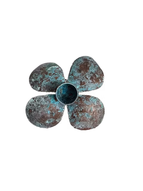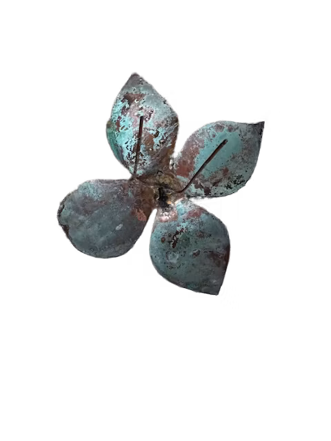 En vacker ljushållare i plåt formad som en blomma med utslagna kronblad. Den har två böjbara pinnar som gör det enkelt att sticka ner ljushållaren i blomsterarrangemang, krukor eller flaskor. Plåten har en vacker, naturlig, grönskimrande patina som ger varje ljushållare ett unikt och charmigt uttryck.