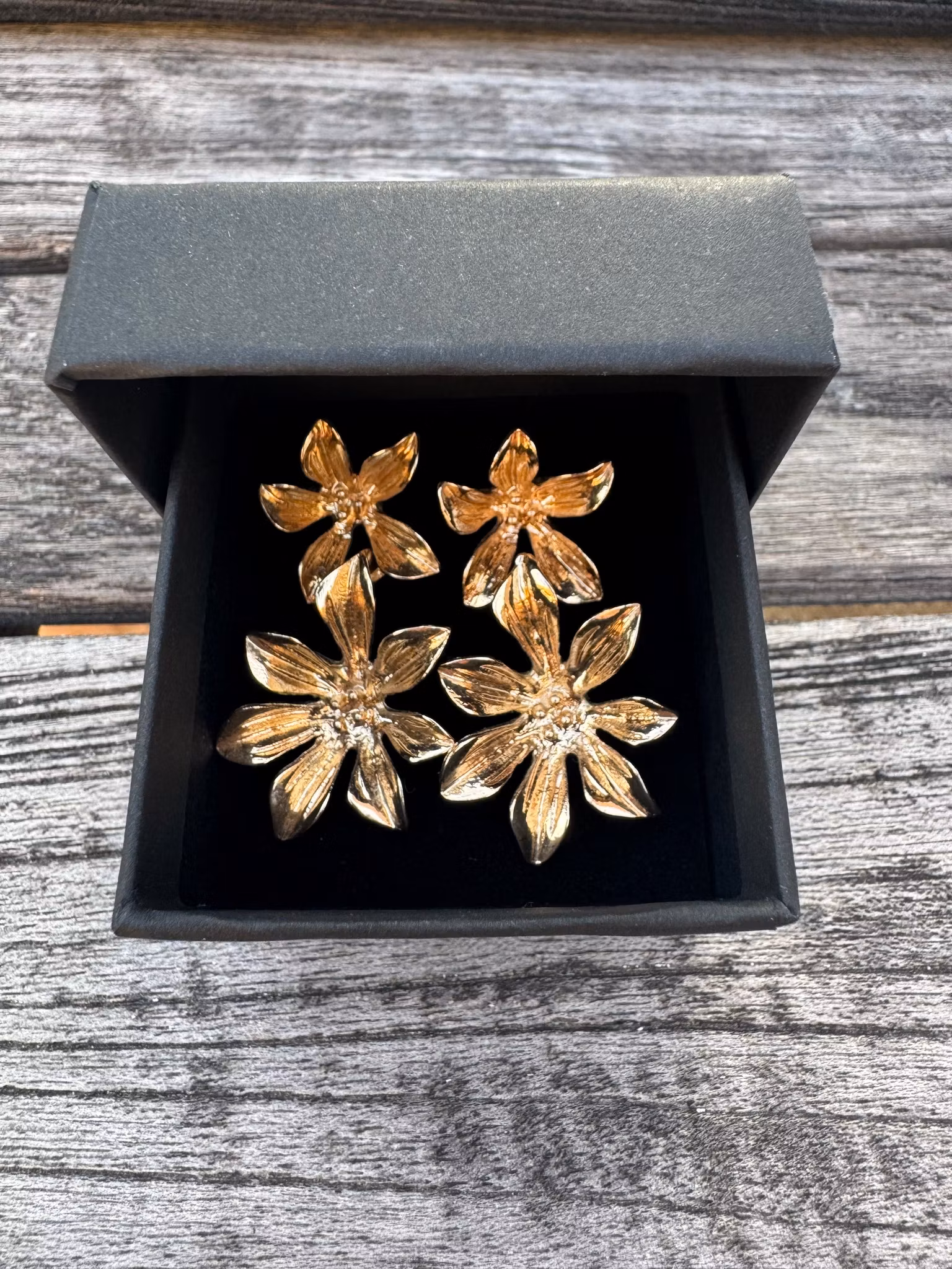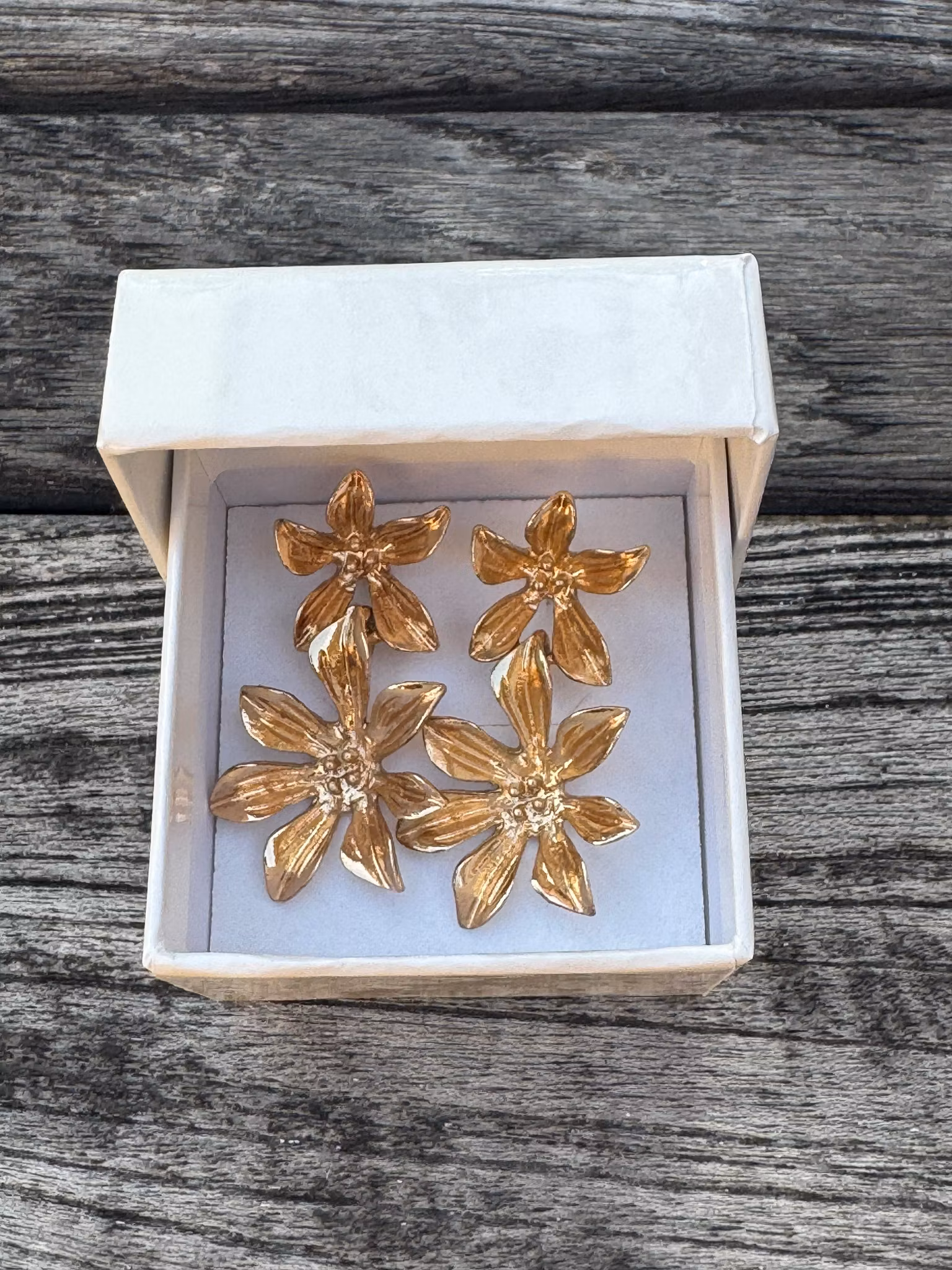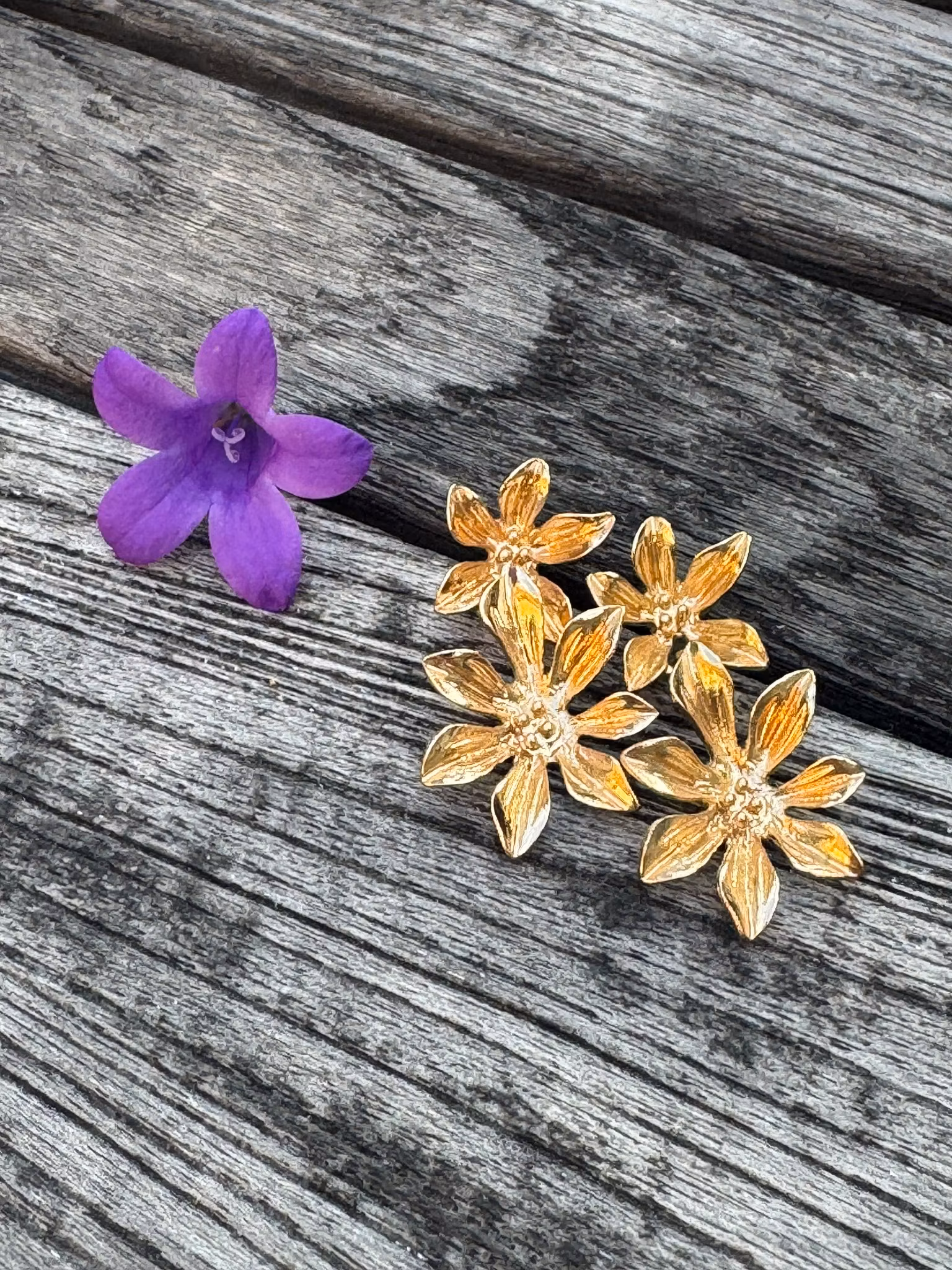 Guldfärgade örhängen i form av blommor som skimrar jättefint på. Ett par örhängen som passar för alla tillfällen.