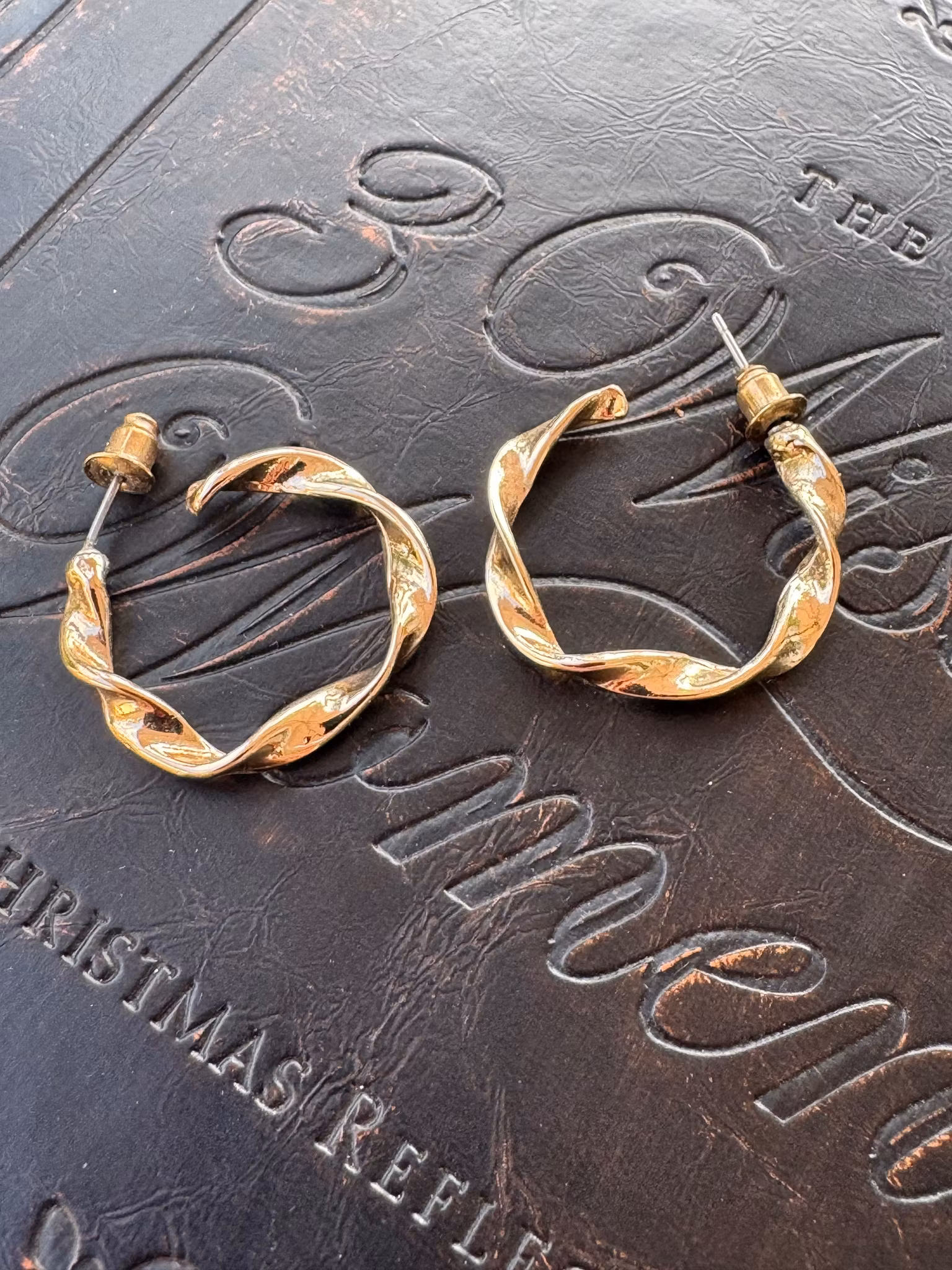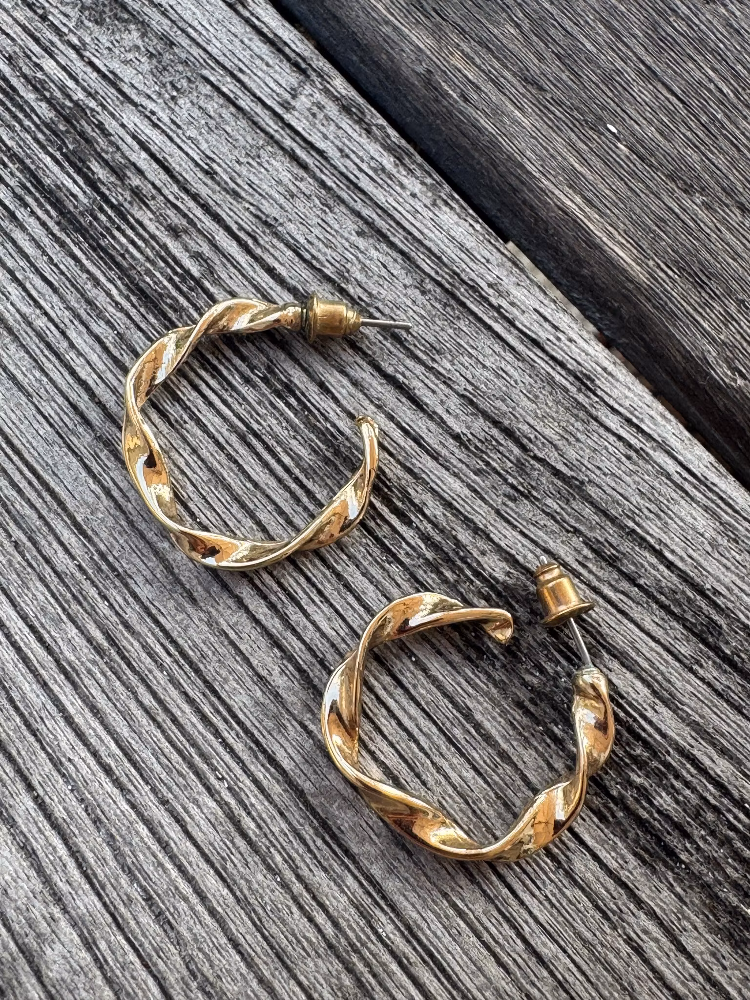 Användbara tvistade guldfärgade örhängen (second hand). Passar perfekt för alla tillfällen. Mycket gott skick. Storlek 2,5 cm i diameter.