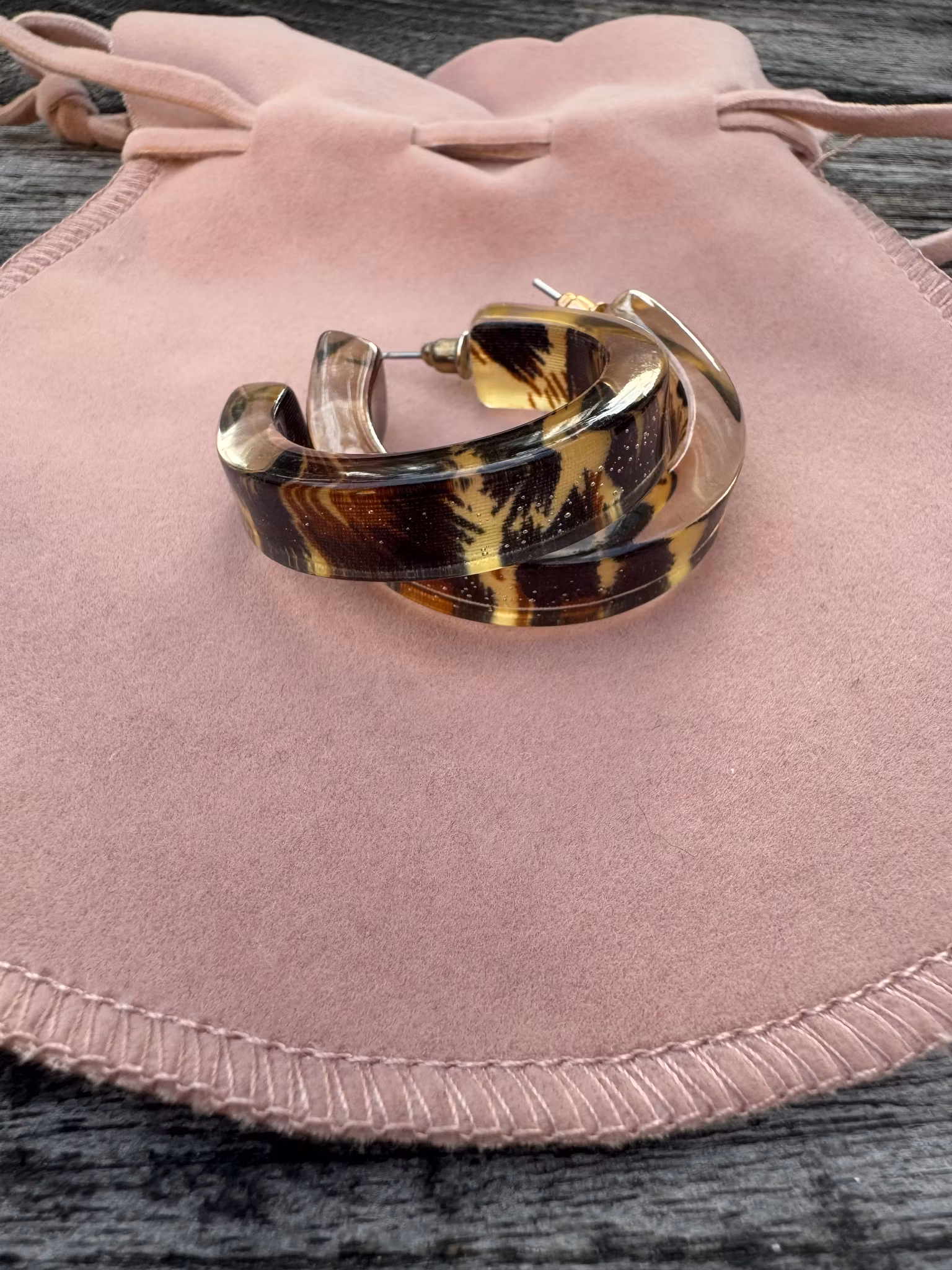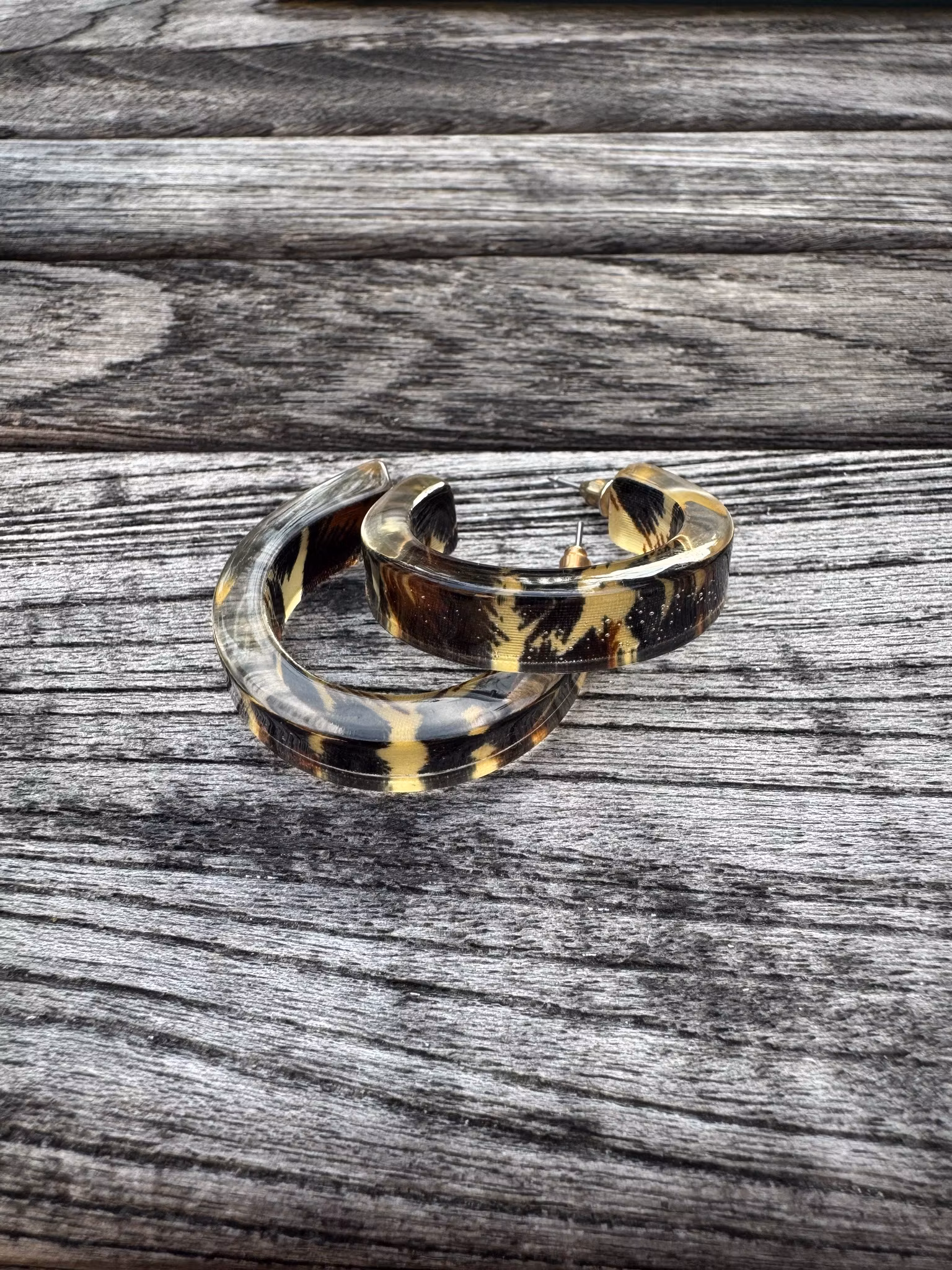 Tuffa örhängen i plast med spräcklig färg (second hand). Mycket gott skick!