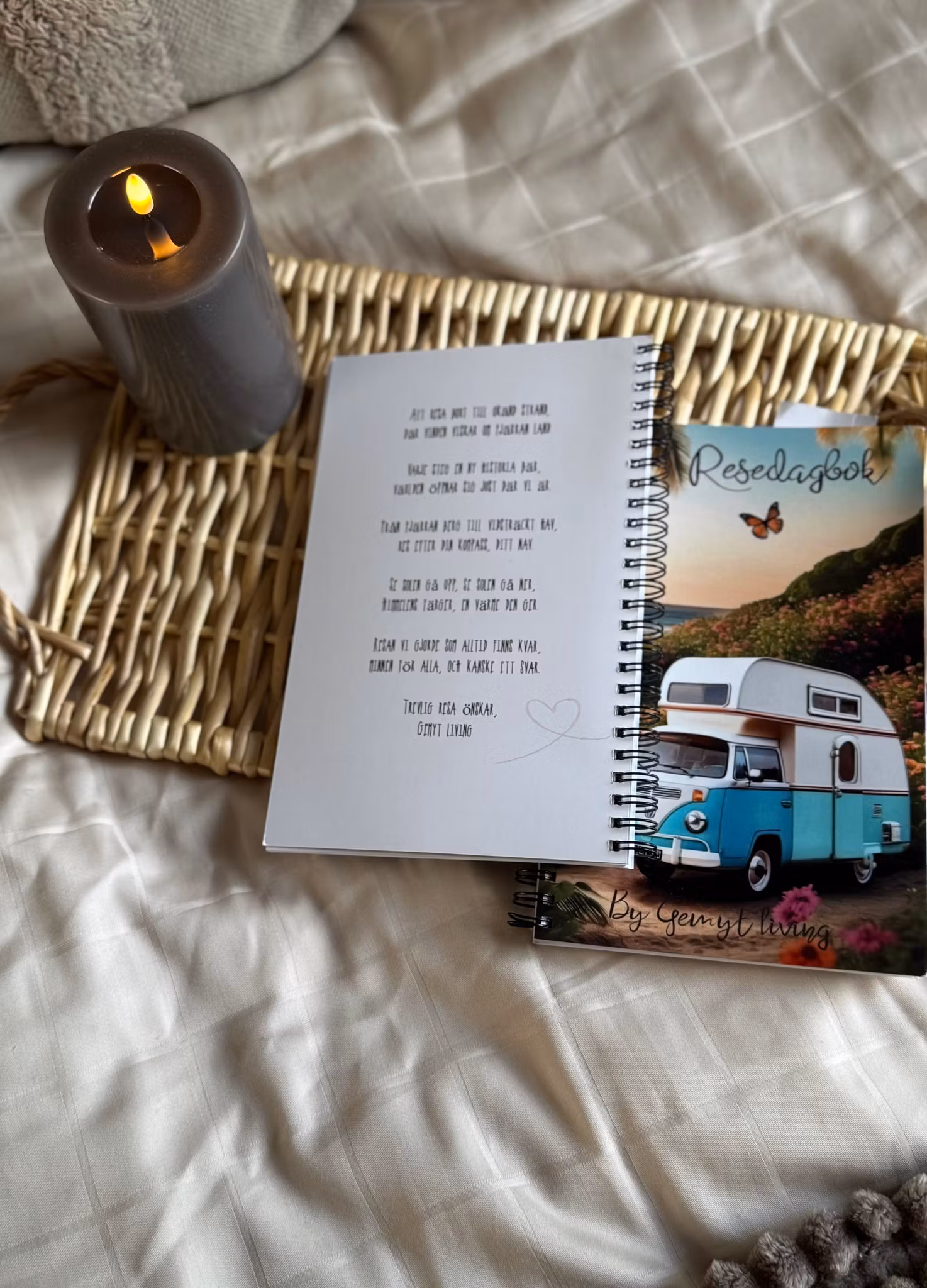 Så ta med er denna dagbok på er nästa husbilsresa – den kommer att bli en värdefull skattkista fylld med minnen från era äventyr! Dagboken är ett praktiskt spiralblock med en snygg tryckt framsida och olinjerade sidor – perfekt för både text och skisser. På insidan finns en liten hälsning - en dikt skriven av oss på Gemyt living.