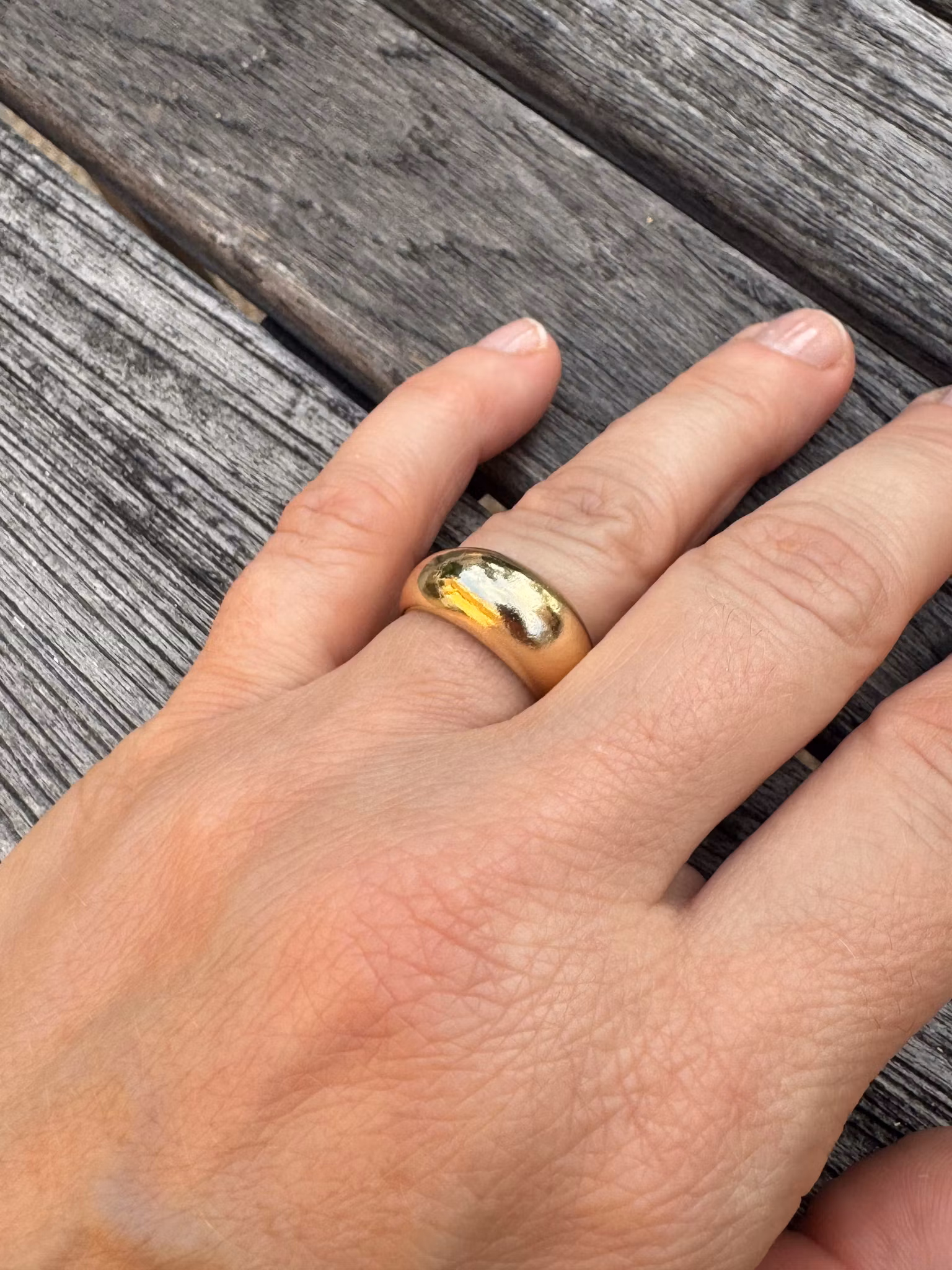 Klassisk guldfärgad ring - Second handEn klassisk och modern guldfärgad ring som blir bredare på mitten. Produktinformation:Storlek: 17GuldfärgadUtförande: