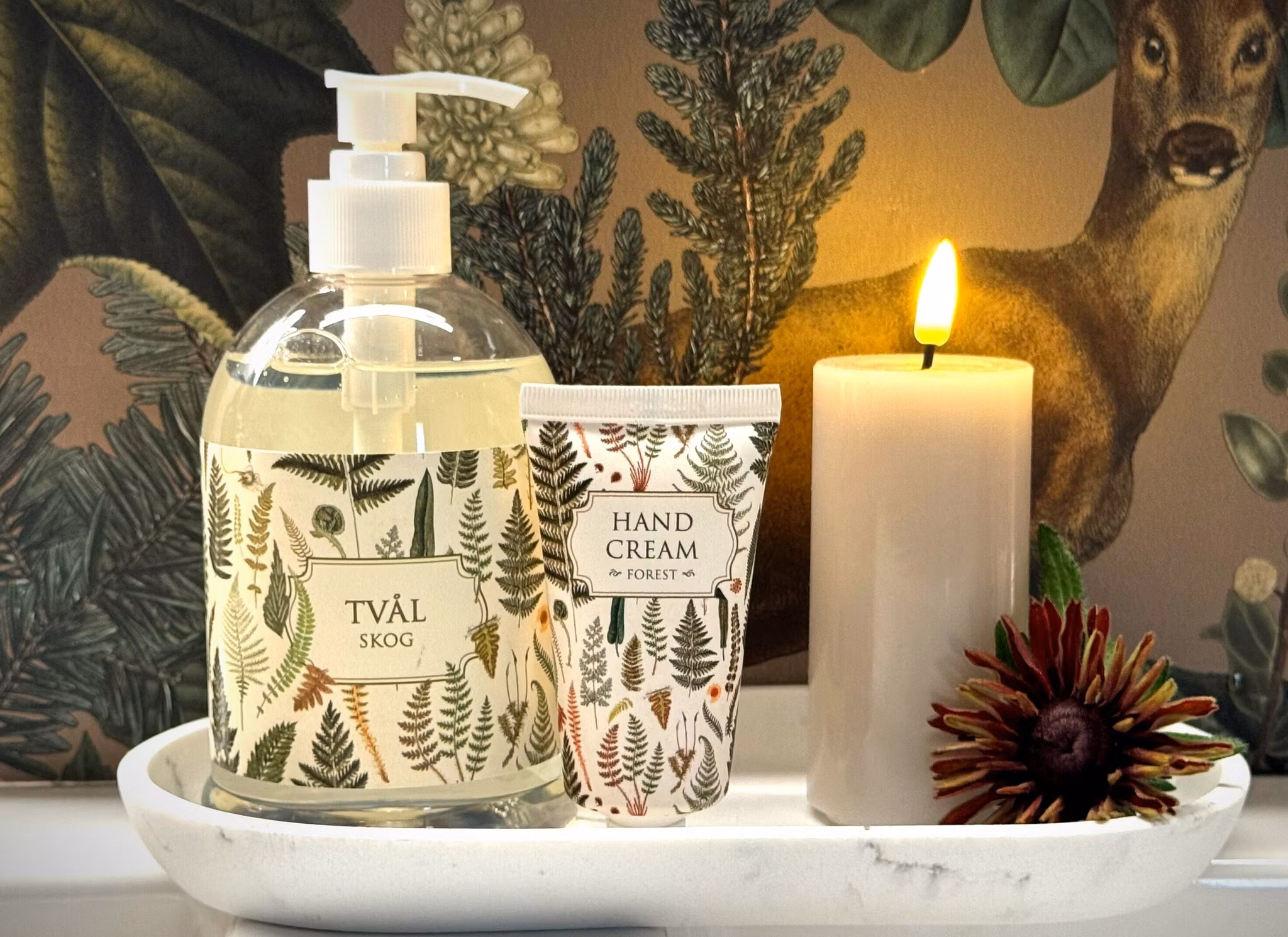 Skäm bort händerna med denna väldoftande pumptvål från Sköna Ting – en mild, vårdande tvål med underbar doft av skog. Tvålen kommer i en vacker flaska med botaniskt mönster, vilket gör den till en lika praktisk som dekorativ detalj i badrummet, köket eller gästtoaletten.