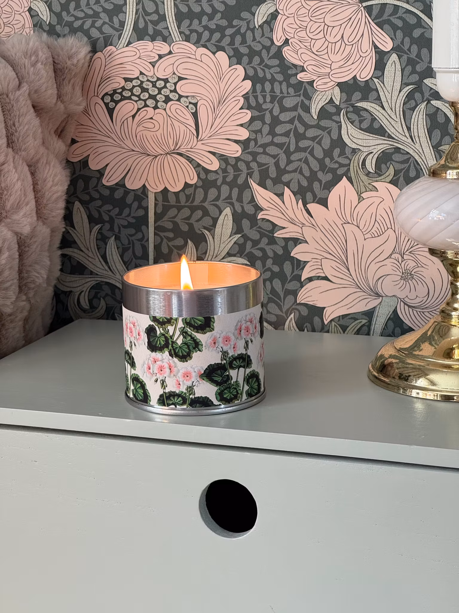 Doftljus av 109% sojavax från Svenska Sköna Ting. Doften av pelargon betyder doft av somnar och minnen.