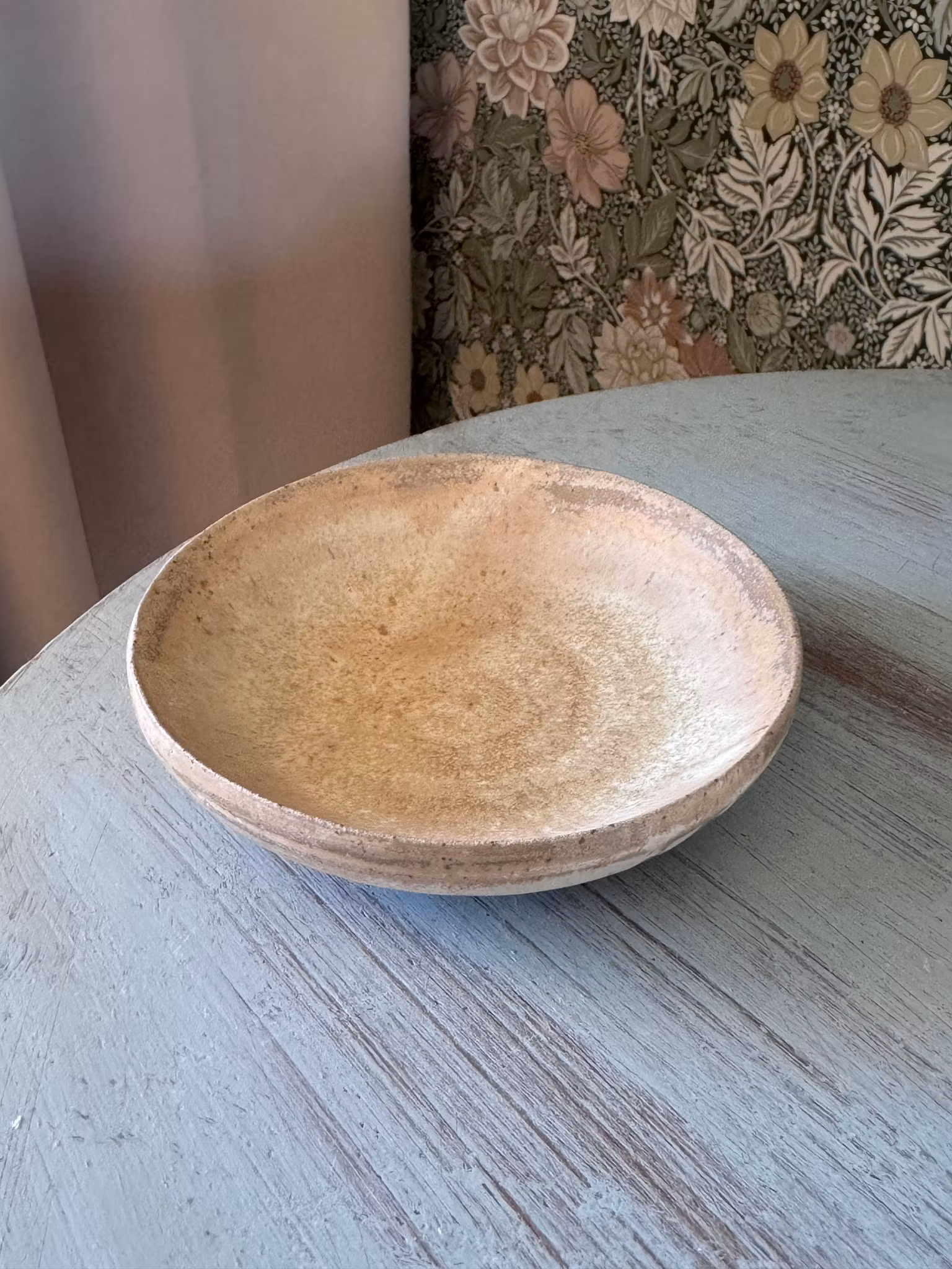 Ett fat i fin beige nyans som fungerar perfekt till smycken eller som ljusfat. Handgjord av Gemyt living.